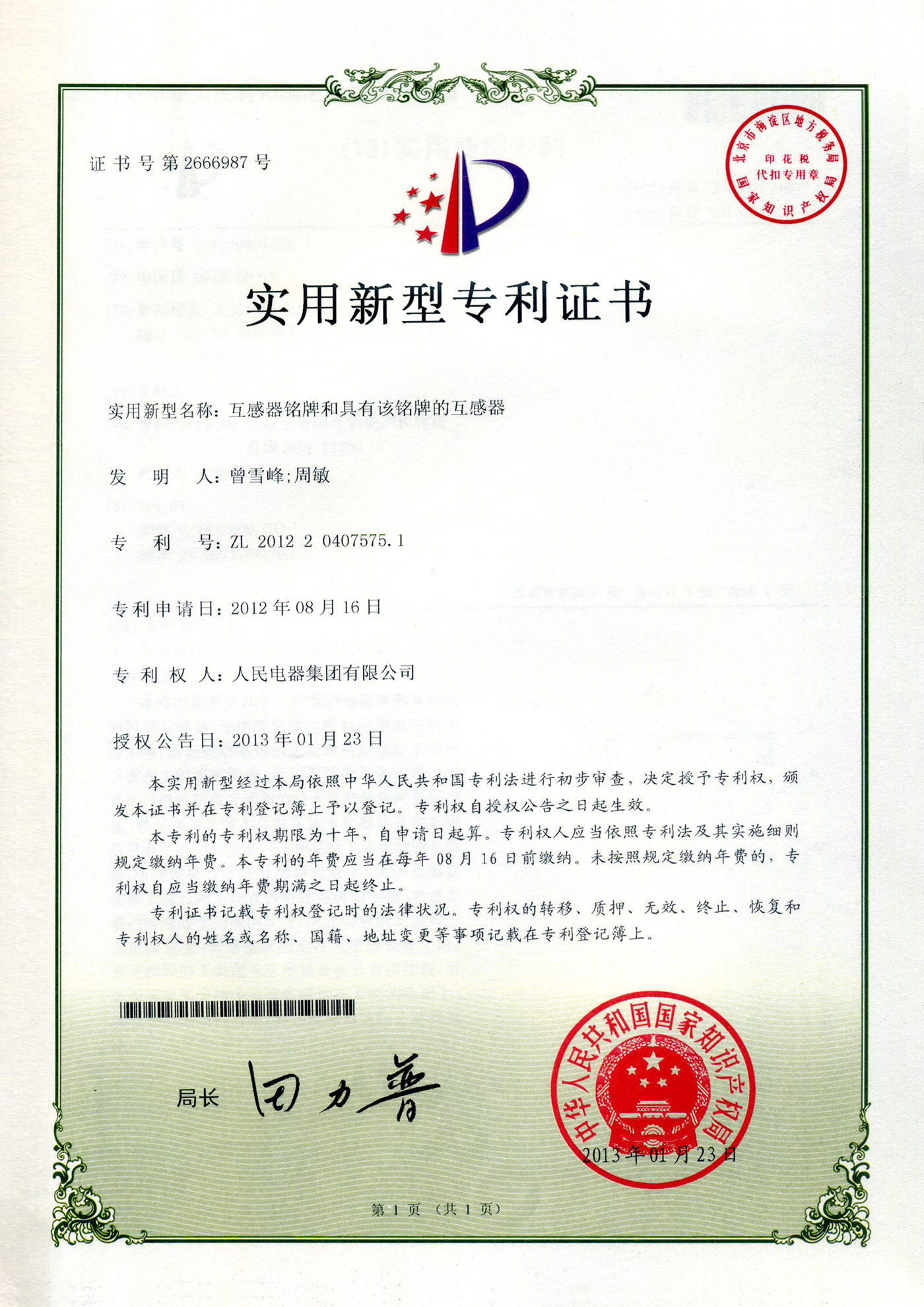 實(shí)用新型專利證書:互感器銘牌和具有該銘牌的互感器(點(diǎn)擊下載)