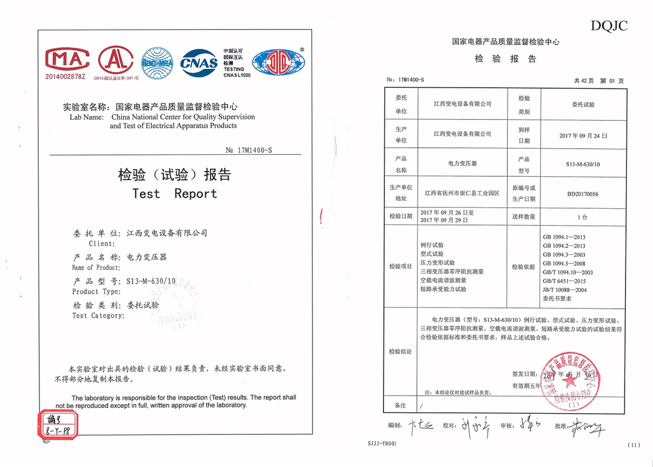 檢驗(試驗)報告:S13-M-630/10電力變壓器(點擊下載)