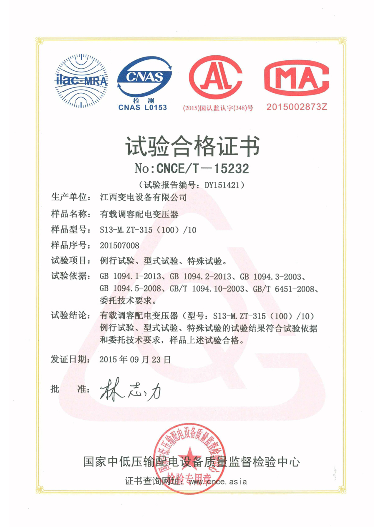 試驗(yàn)合格證書(shū):S13-M.ZT-315(100)/10有載調(diào)容配電變壓器(點(diǎn)擊下載)