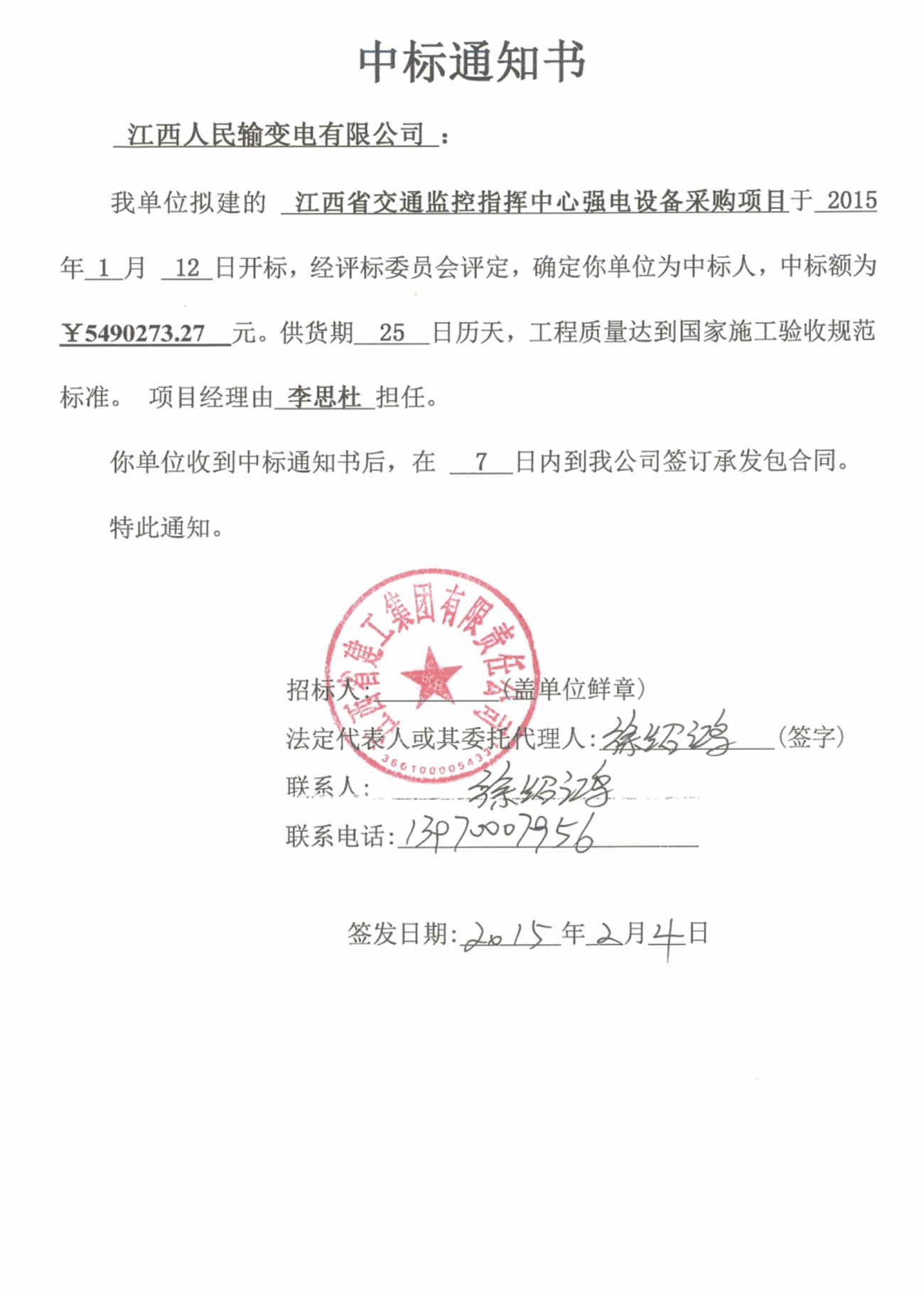 中標(biāo)通知書:江西省交通監(jiān)控指揮中心強(qiáng)電設(shè)備采購項(xiàng)目(點(diǎn)擊下載)