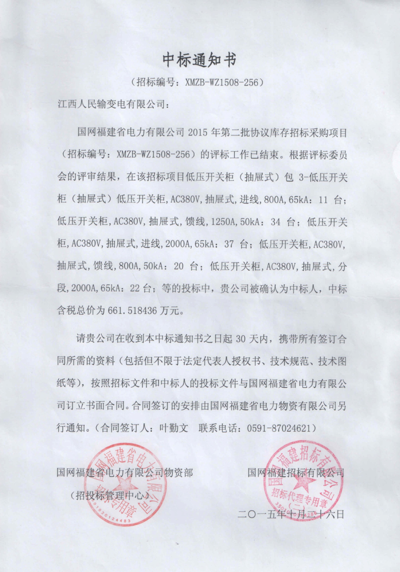 中標(biāo)通知書:國(guó)網(wǎng)福建省電力有限公司2015年第二批協(xié)議庫(kù)存招標(biāo)采購(gòu)項(xiàng)目(點(diǎn)擊下載)