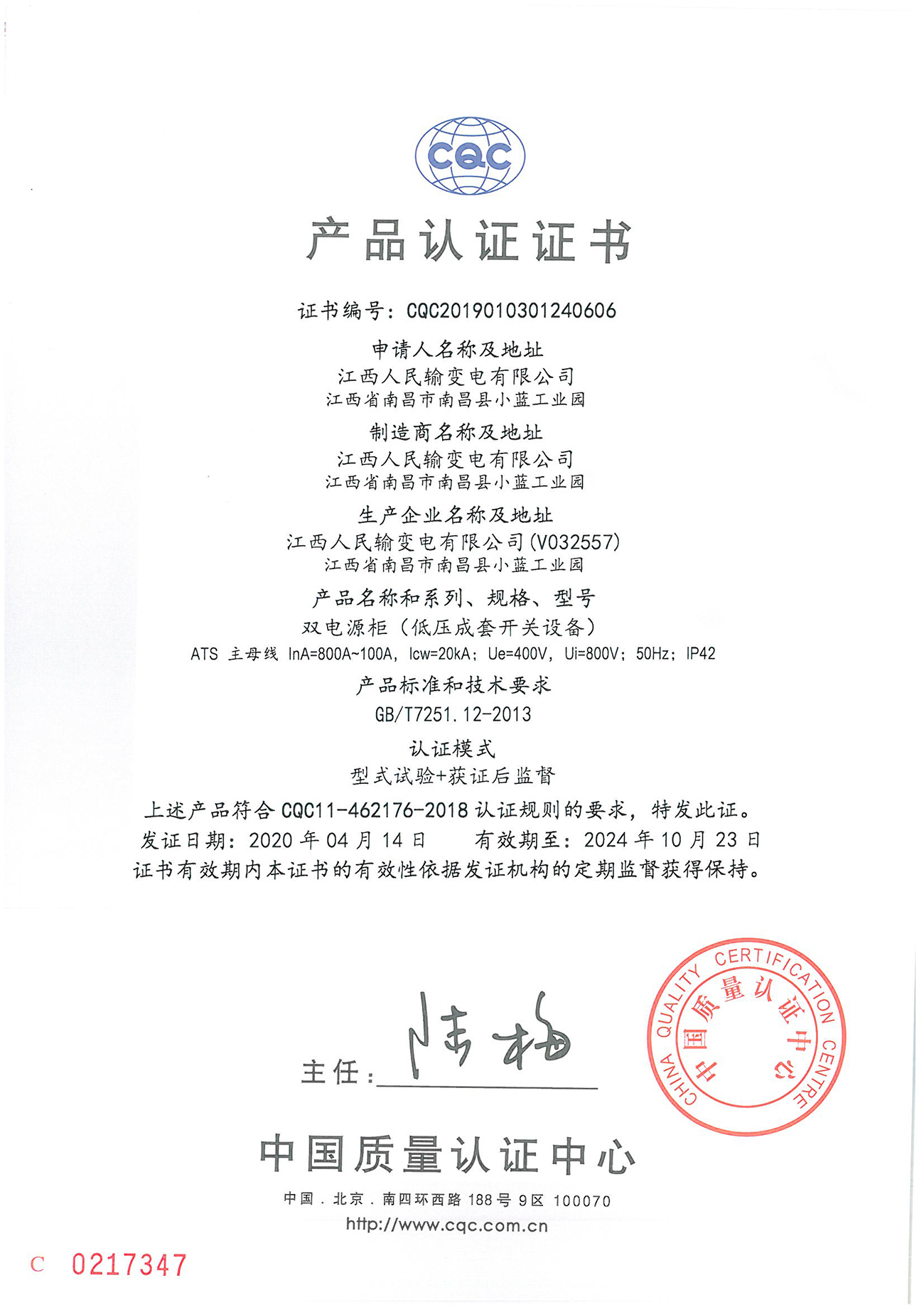 CQC認證證書: ATS 800A~100A IP42雙電源柜(低壓成套開關設備)(證書編號:CQC2019010301240606)(點擊下載)
