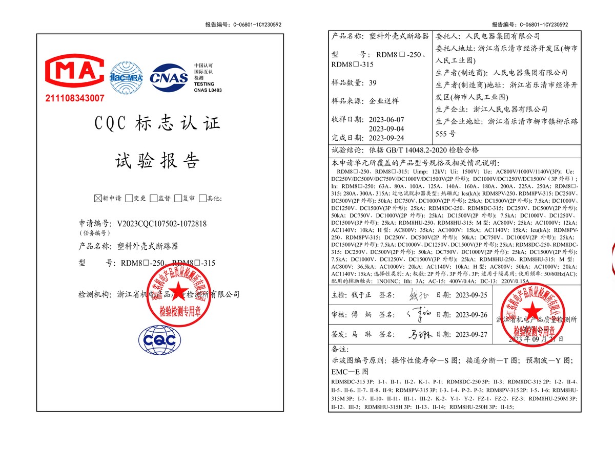 CQC試驗報告(202309):RDM8□-250,RDM8□-315塑料外殼式斷路器(點擊下載)