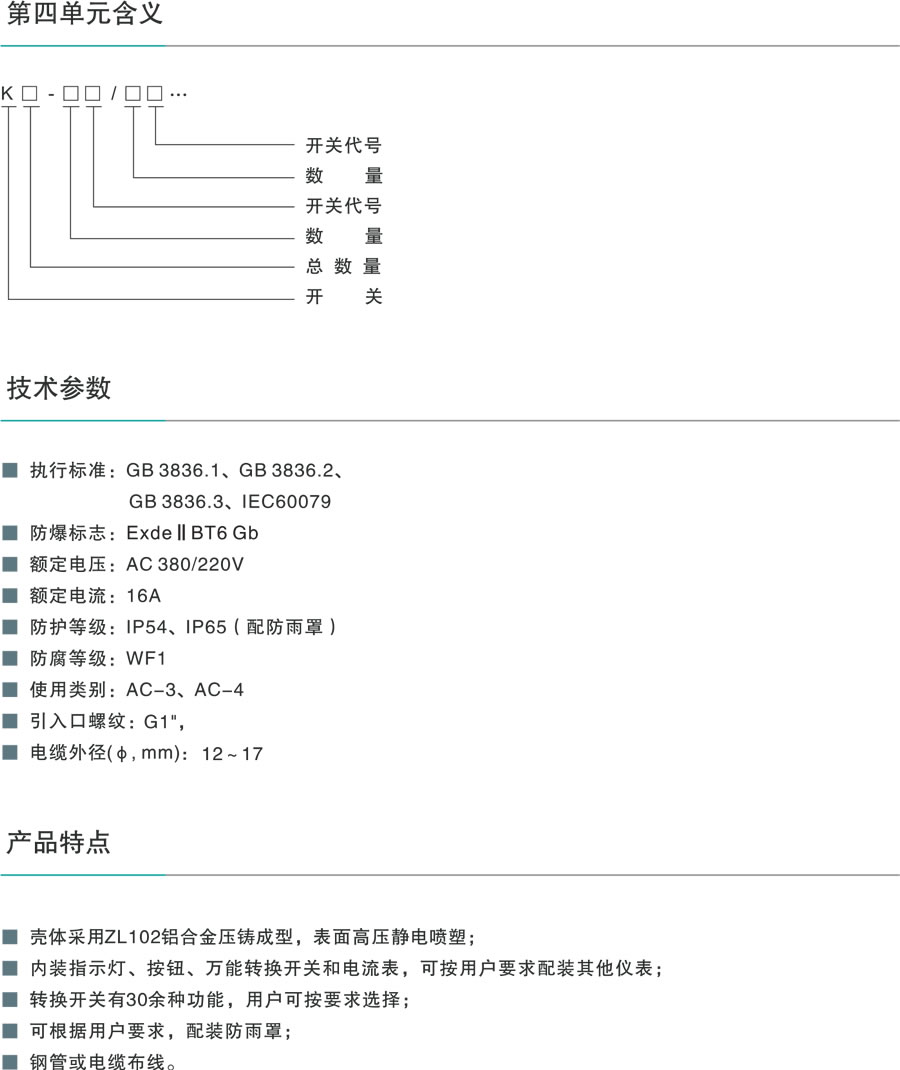 適用于1區(qū)、2區(qū)危險場所。 適用于ⅡA、ⅡB類,溫度組別為T1~T6的爆炸性氣體環(huán)境。