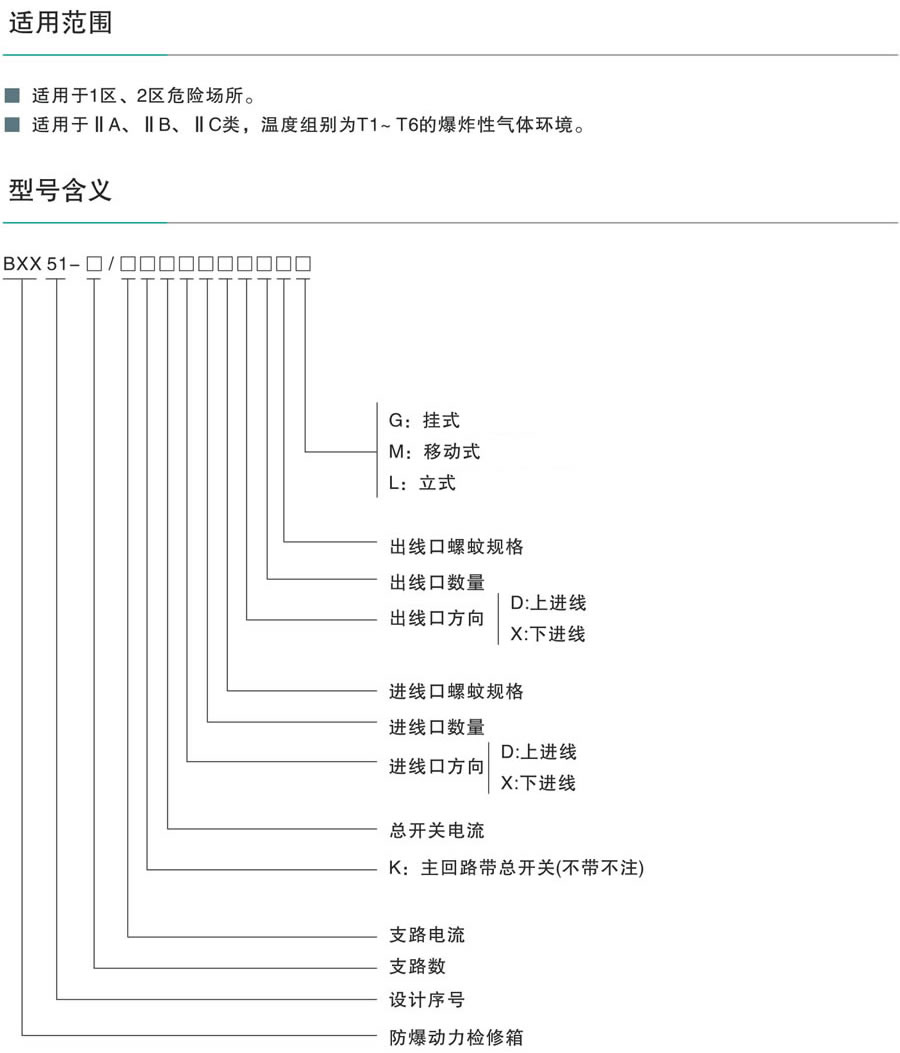 適用于1區(qū)、2區(qū)危險(xiǎn)場所。 適用于ⅡA、ⅡB類,溫度組別為T1~T4的爆炸性氣體環(huán)境。