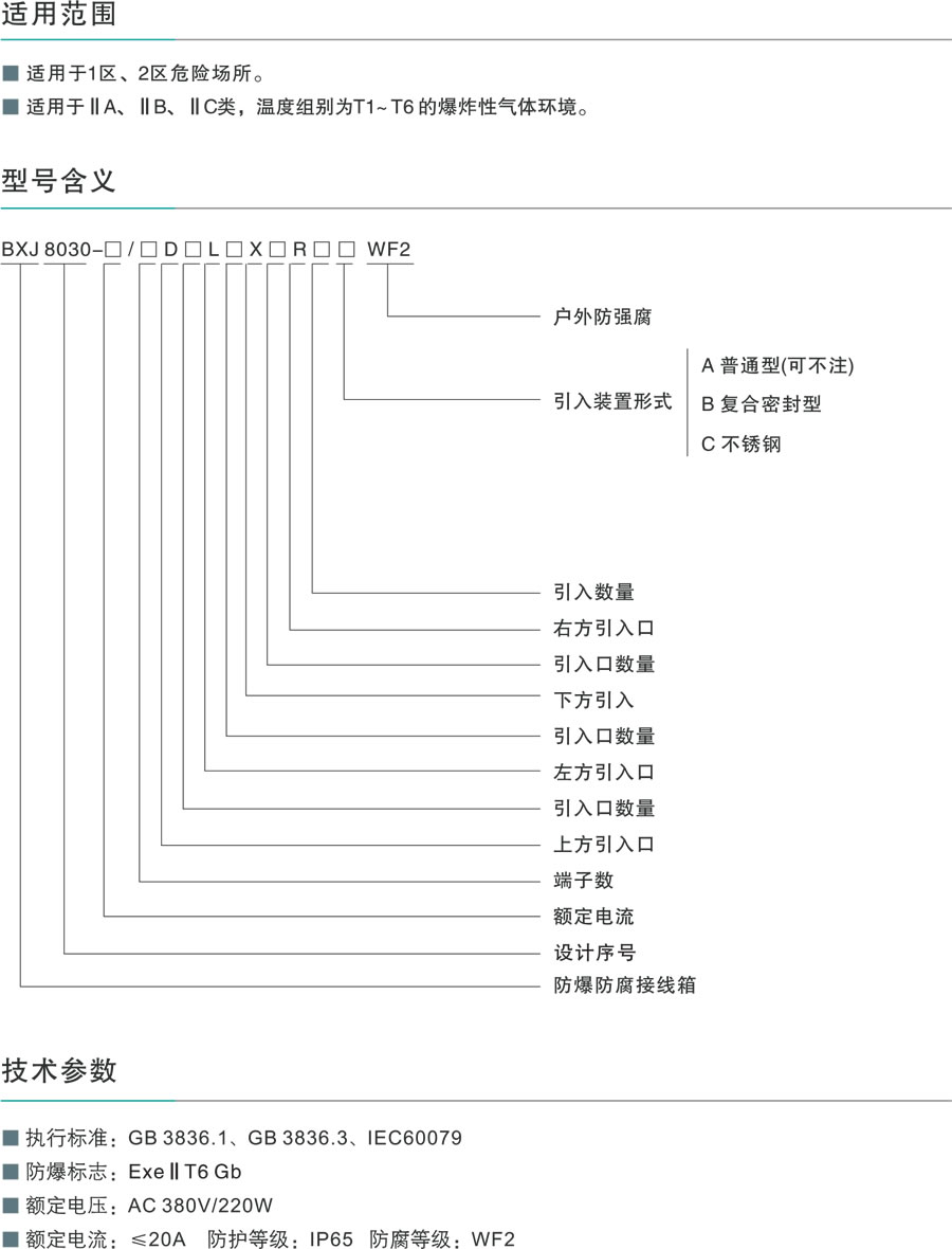 適用于1區(qū)、2區(qū)危險場所。 適用于ⅡA、ⅡB、ⅡC類,溫度組別為T1~T6的爆炸性氣體環(huán)境。