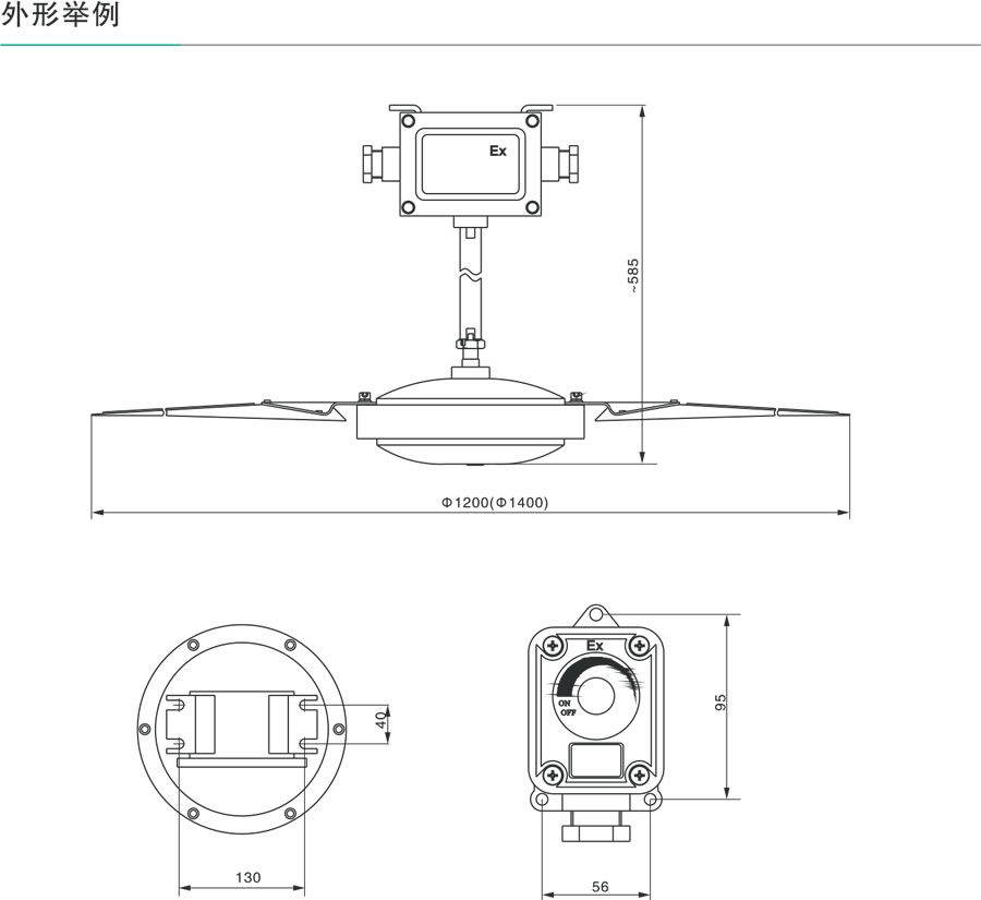 吊扇由防爆電機(jī)、扇葉、防爆接線盒、防爆電子調(diào)壓器等部分組成。防爆電機(jī)外殼采用ZL102鋁合金壓鑄成型,表面高壓靜電噴塑。防爆電子調(diào)壓器供吊扇調(diào)整風(fēng)速之用,采用電子式無級調(diào)速,使吊扇運(yùn)行安全、穩(wěn)定、可靠且不易損壞防爆電機(jī)。鋼管或電纜布線。