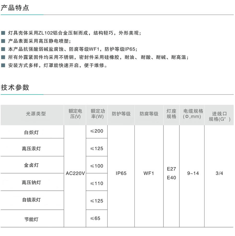 燈具殼體采用ZL102鋁合金壓制而成,結(jié)構(gòu)輕巧,外形美觀;產(chǎn)品表面采用高壓靜電噴塑 本產(chǎn)品抗強(qiáng)酸弱堿鹽腐蝕、防腐等級WF1,防護(hù)等級IP65;所有外露緊固件均釆用不銹鋼,密封件采用硅橡膠,耐油、耐酸、耐堿、耐高溫安裝方式多樣,燈罩能快速開啟,便于維修。