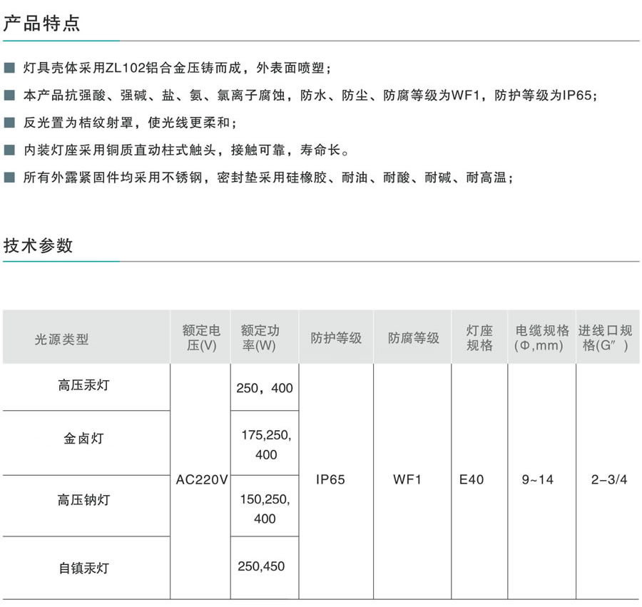 燈具殼體采用ZL102鋁合金壓鑄而成,外表面噴塑;本產(chǎn)品抗強(qiáng)酸、強(qiáng)堿、鹽、氨、氯離子腐蝕,防水、防塵、防腐等級為WF1,防護(hù)等級為IP65;反光置為桔紋射罩,使光線更柔和;