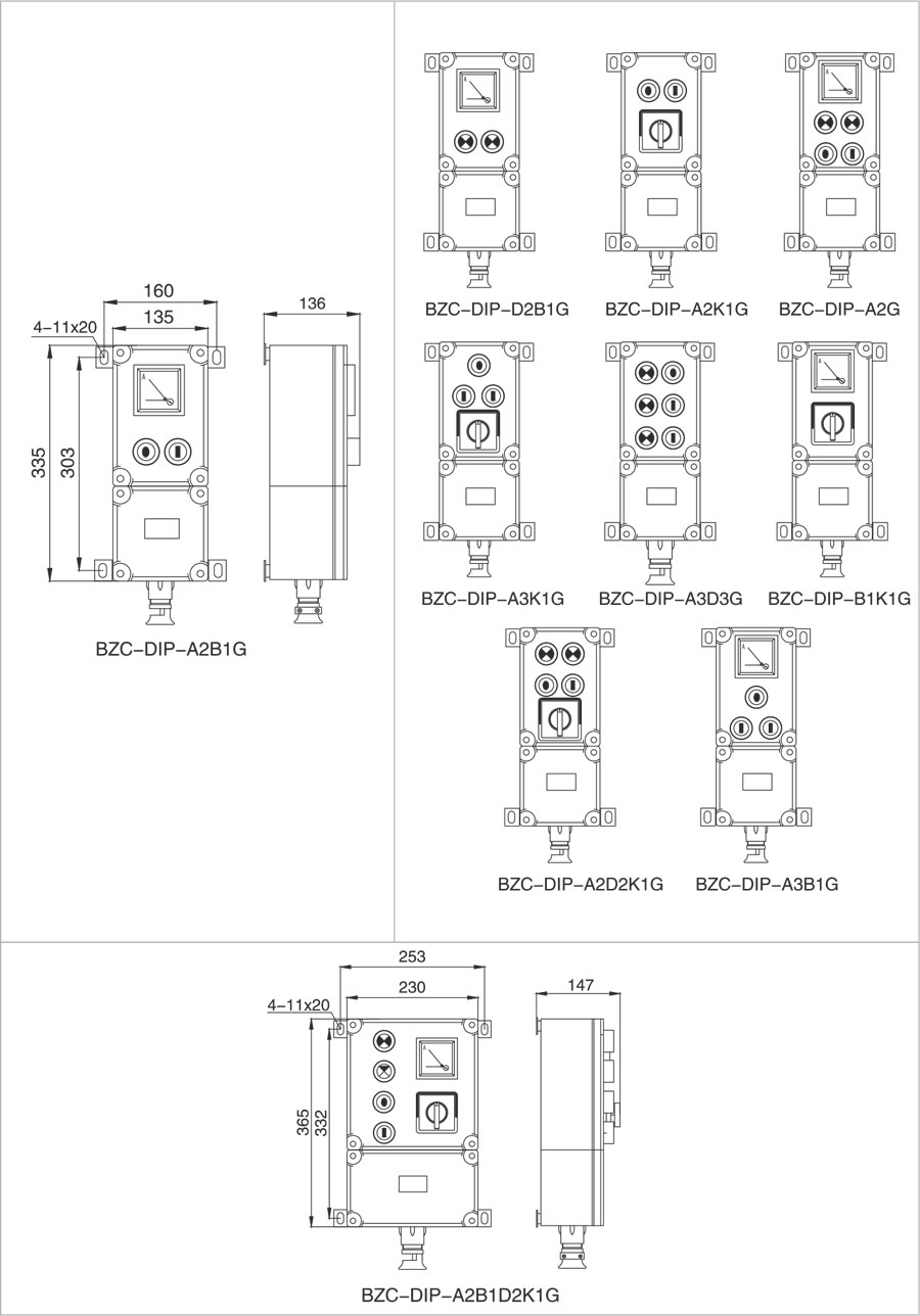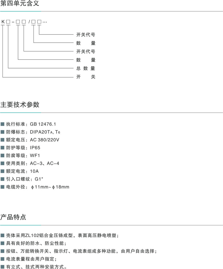 殼體采用ZL102鋁合金壓鑄成型,表面高壓靜電噴塑;具有良好的防水、防塵性能; 按鈕、萬(wàn)能轉(zhuǎn)換開關(guān)、指示燈、電流表組成多種功能,由用戶自由選擇;電流表量程由用戶指定; 有立式、掛式兩種安裝方式。