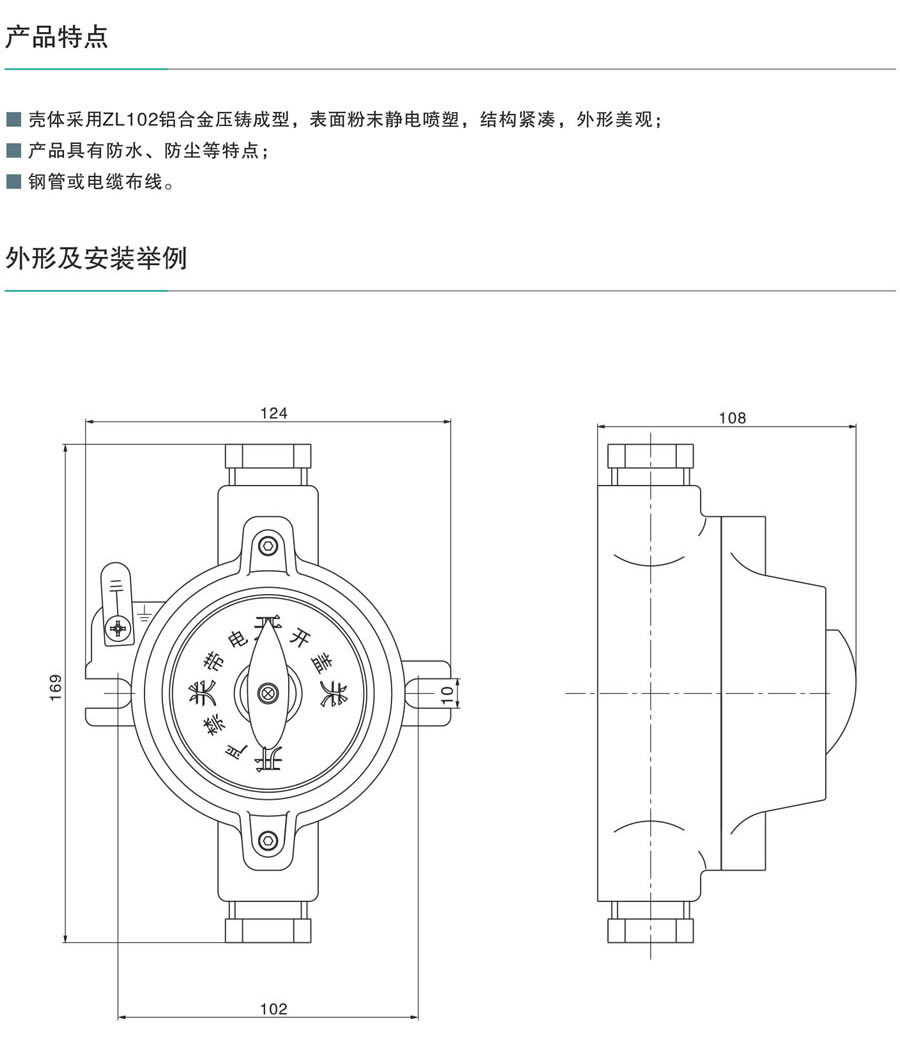 殼體采用ZL102鋁合金壓鑄成型,表面粉末靜電噴塑,結(jié)構(gòu)緊湊,外形美觀;產(chǎn)品具有防水、防塵等特點(diǎn);鋼管或電纜布線。