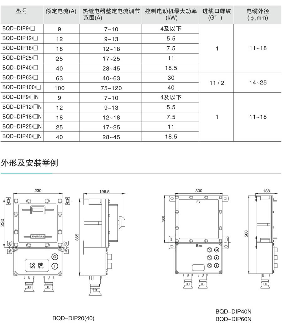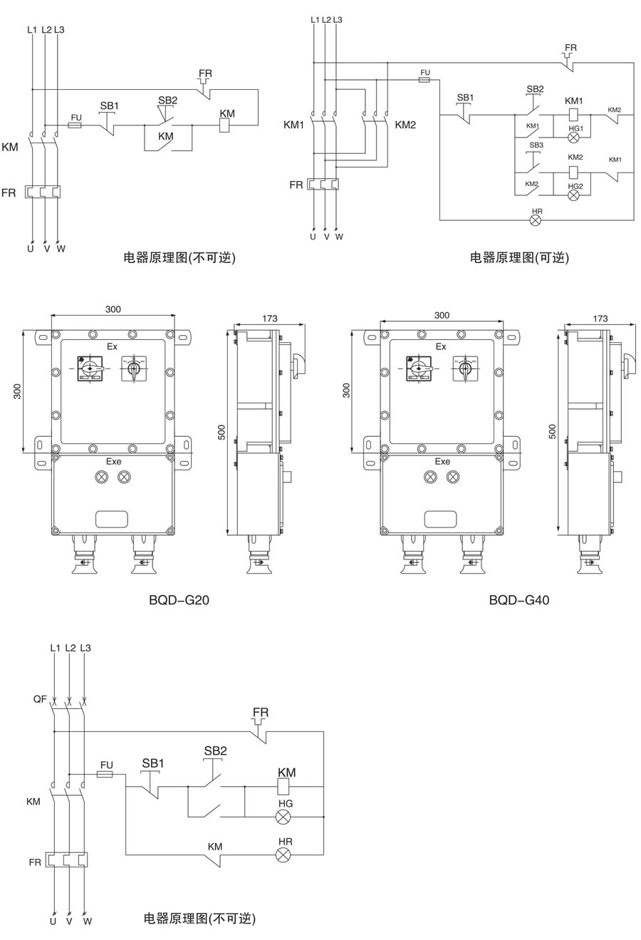 殼體采用ZL102鋁合金壓鑄成型,表面高壓靜電噴塑;內(nèi)裝交流接觸器、熱繼電器、自復(fù)位萬能開關(guān)或按鈕等;可控制50Hz、380V三相異步電動機(jī)的直接起動、停止,并具有過載、缺相、失壓保護(hù)功能;鋼管或電纜布線。