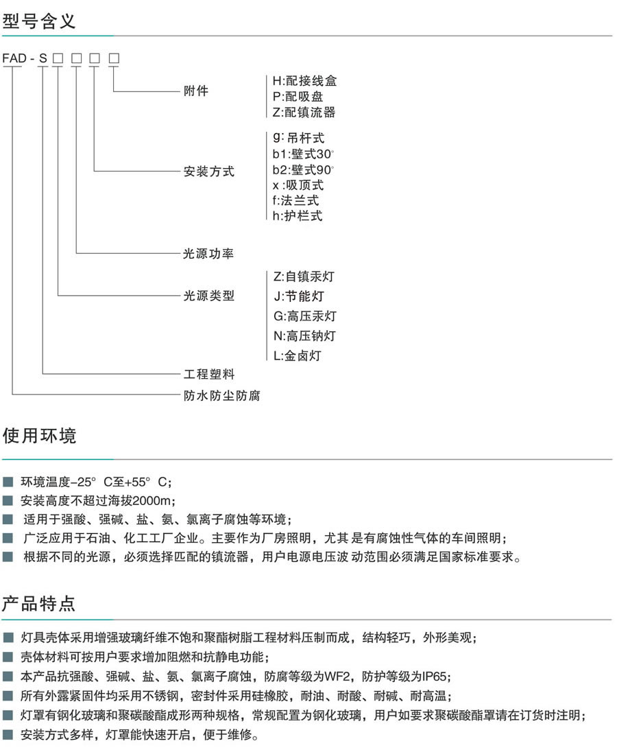 燈具殼體采用增強玻璃纖維不飽和聚酯樹脂工程材料壓制而成,結構輕巧,外形美觀;殼體材料可按用戶要求增加阻燃和抗靜電功能;本產品抗強酸、強堿、鹽、氨、氯離子腐蝕,防腐等級為WF2,防護等級為P65;所有外露緊固件均釆用不銹鋼,密封件采用硅橡膠,耐油、耐酸、耐堿、耐高溫;燈罩有鋼化玻璃和聚碳酸酯成形兩種規(guī)格,常規(guī)配置為鋼化玻璃,用戶如要求聚碳酸酯罩請在訂貨時注明;安裝方式多樣,燈罩能快速開啟,便于維修;