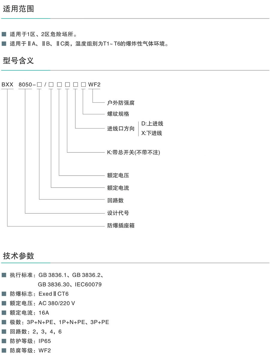 適用于1區(qū)、2區(qū)危險場所。 適用于ⅡA、ⅡB、ⅡC類,溫度組別為T1~T6的爆炸性氣體環(huán)境。