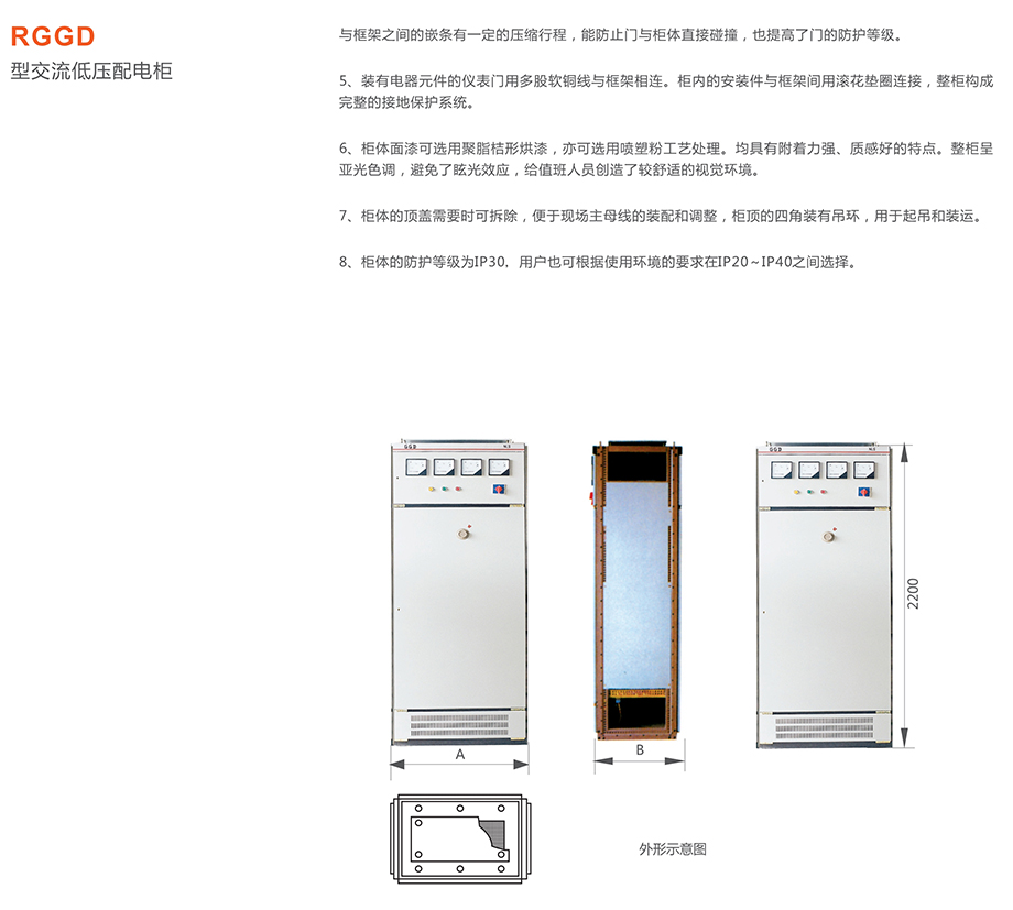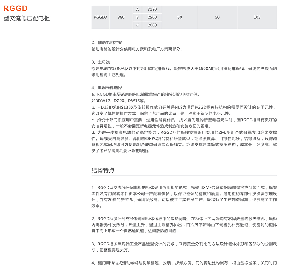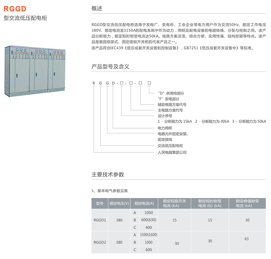 RGGD型交流低壓配電柜適用于發(fā)電廠、變電所、工業(yè)企業(yè)等電力用戶作為交流50Hz,額定工作電壓380V,額定電流至3150A的配電系統(tǒng)中作為動力,照明及配電設(shè)備的電能轉(zhuǎn)換、分配與控制之用。該產(chǎn)品分?jǐn)嗄芰?,額定短時(shí)耐受電流達(dá)50kA。線路方案靈活、組合方便強(qiáng)、結(jié)構(gòu)新穎等特點(diǎn)。該產(chǎn)