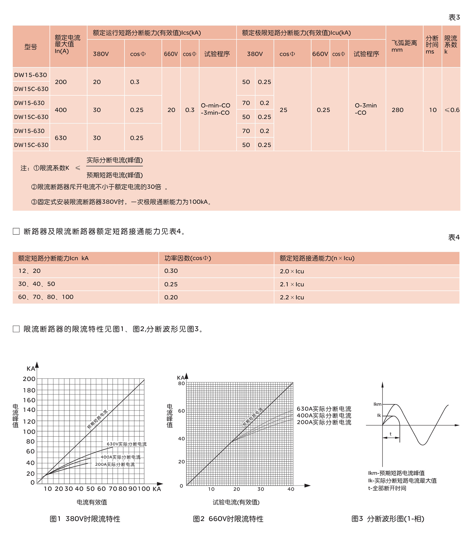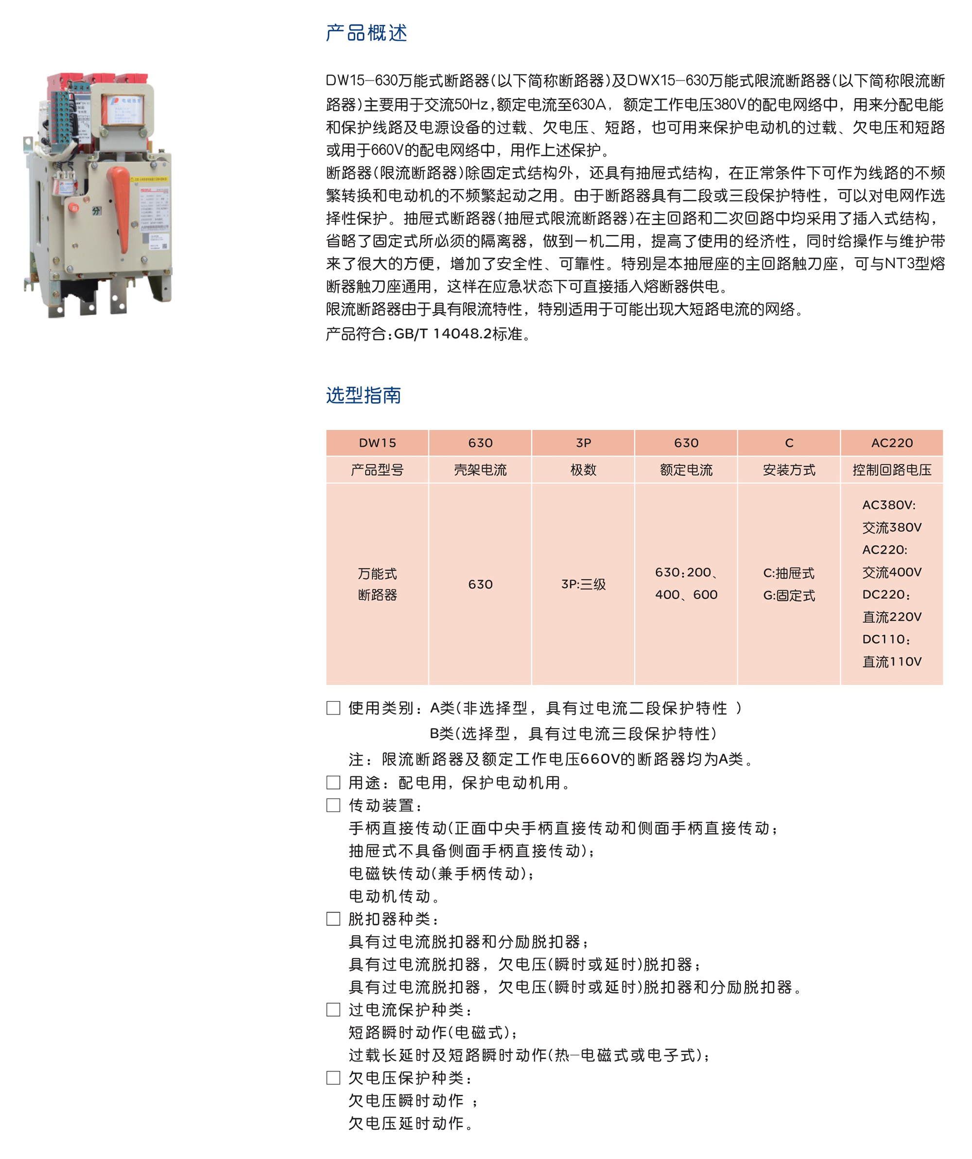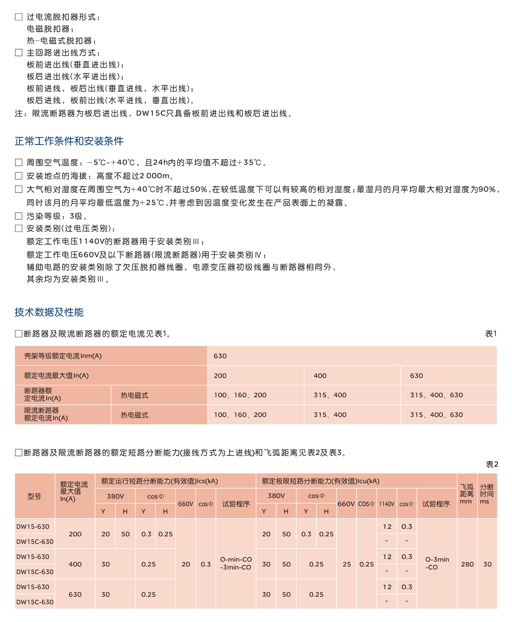 DW15-630萬(wàn)能式斷路器(以下簡(jiǎn)稱(chēng)斷路器)及DWX15-630萬(wàn)能式限流斷路器(以下簡(jiǎn)稱(chēng)限流斷路器)主要用于交流50Hz額定電流至630A,額定工作電壓380V的配電網(wǎng)絡(luò)中,用來(lái)分配電能和保護(hù)線路及電源設(shè)備的過(guò)載、欠電壓、短路,也可用來(lái)保護(hù)電動(dòng)機(jī)的過(guò)載、欠電壓和短路或用于660V的配電網(wǎng)絡(luò)中,用作上述保護(hù)。此外斷路器還可以用于1140的配電網(wǎng)絡(luò),作上述保護(hù)