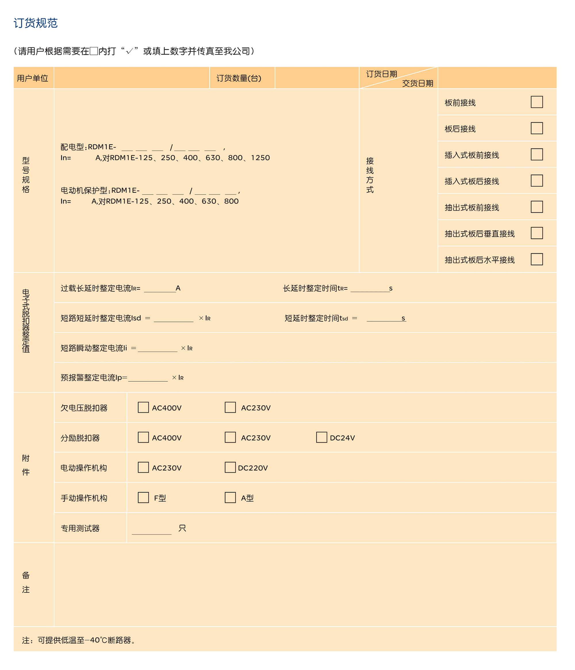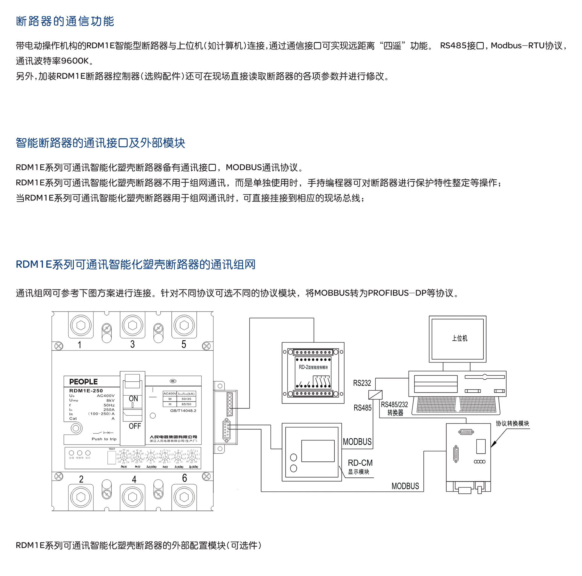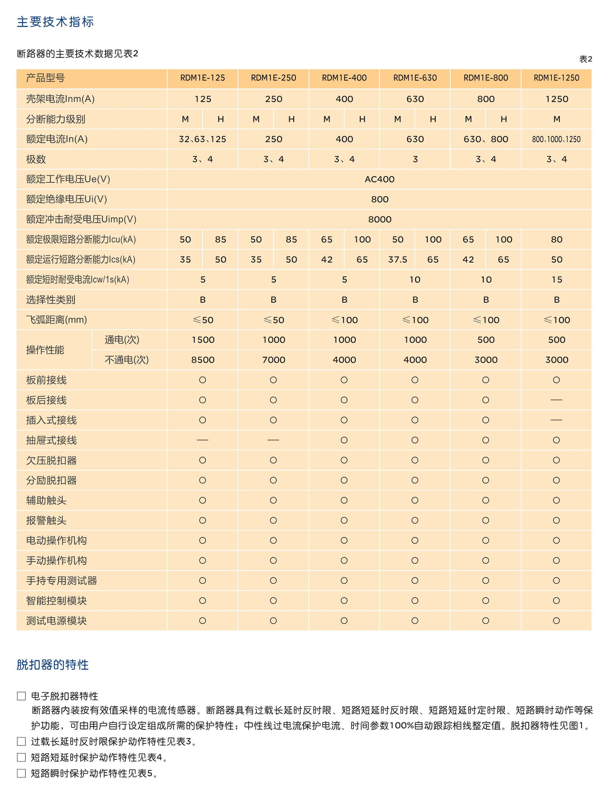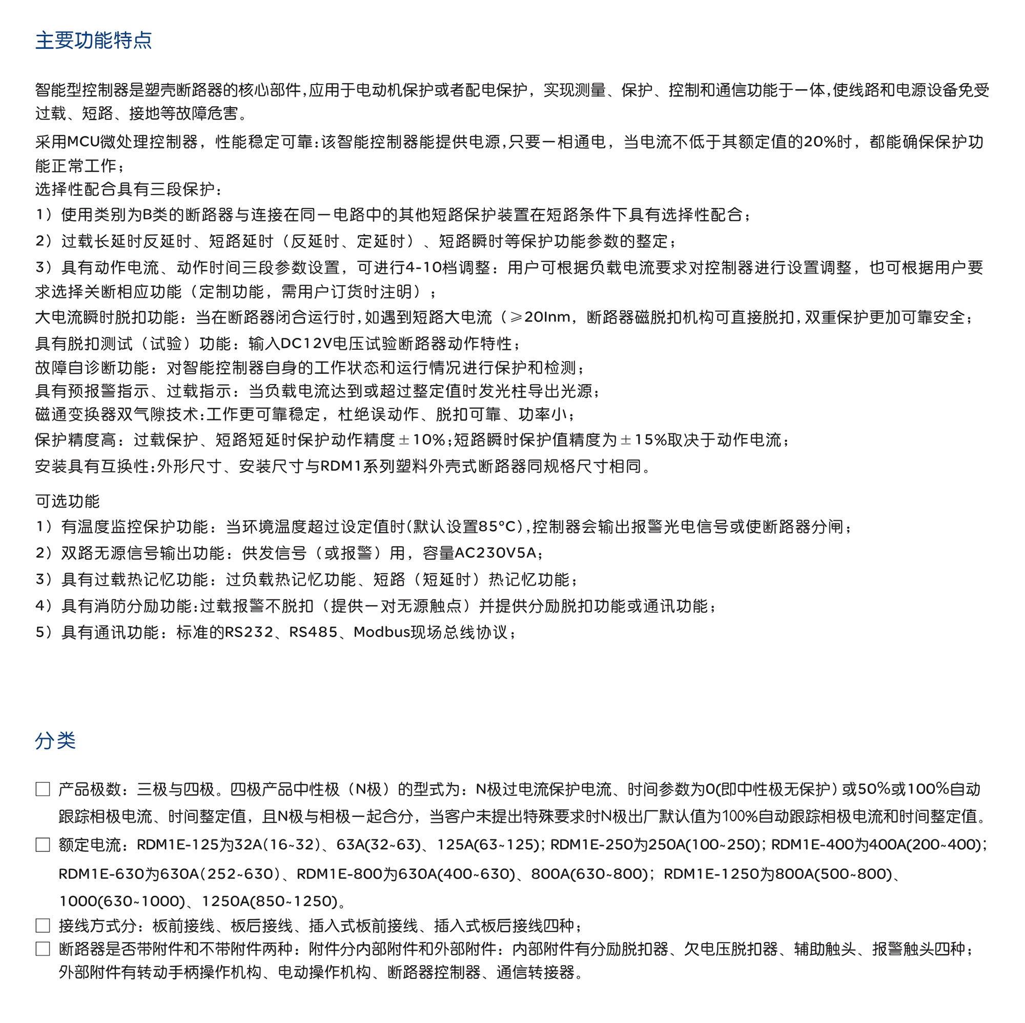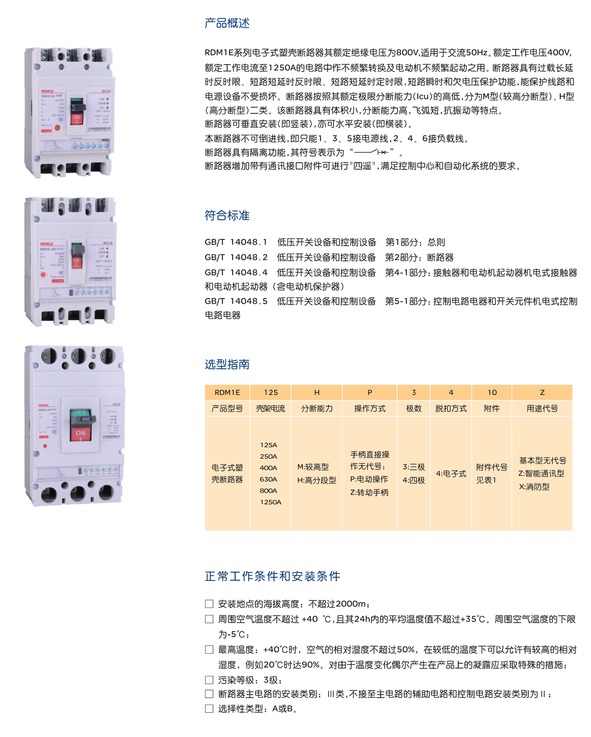 RDM1E系列電子式塑殼斷路器其額定絕緣電壓為800V,適用于交流50Hz。額定工作電壓400V,額定工作電流至1250A的電路中作不頻繁轉(zhuǎn)換及電動(dòng)機(jī)不頻繁起動(dòng)之用。斷路器具有過載長(zhǎng)延時(shí)反時(shí)限、短路短延時(shí)反時(shí)限、短路短延時(shí)定時(shí)限,短路瞬時(shí)和欠電壓保護(hù)功能,能保護(hù)線路和電源設(shè)備不受損壞。斷路器按照其額定極限分?jǐn)嗄芰?Icu)的高低,分為M型(較高分?jǐn)嘈?、H型(高分?jǐn)嘈?二類。該斷路器具有體積小,分?jǐn)嗄芰Ω?飛弧短,抗振動(dòng)等特點(diǎn)。