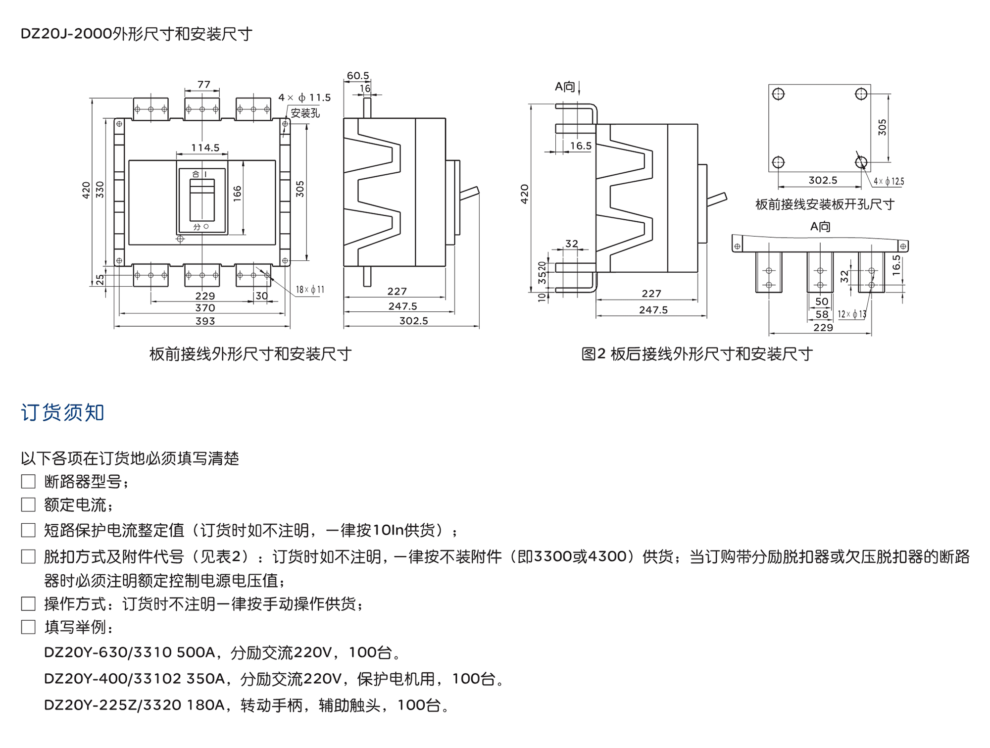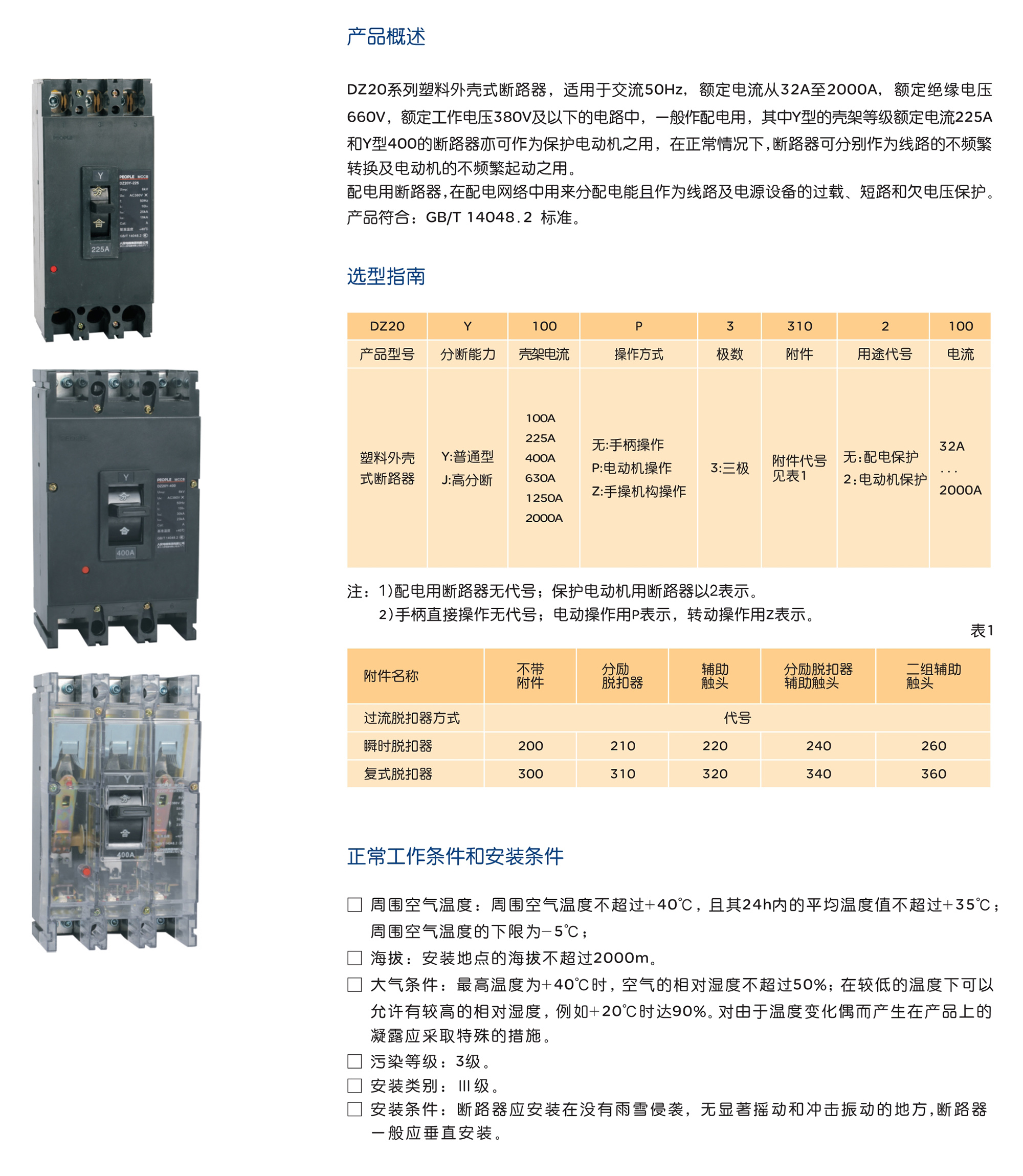 DZ20系列塑料外殼式斷路器,適用于交流50Hz,額定電流從32A至2000A,額定絕緣電壓660V,額定工作電壓380V及以下的電路中,一般作配電用,其中Y型的殼架等級額定電流225A和Y型400的斷路器亦可作為保護(hù)電動機之用,在正常情況下,斷路器可分別作為線路的不頻繁轉(zhuǎn)換及電動機的不頻繁起動之用。