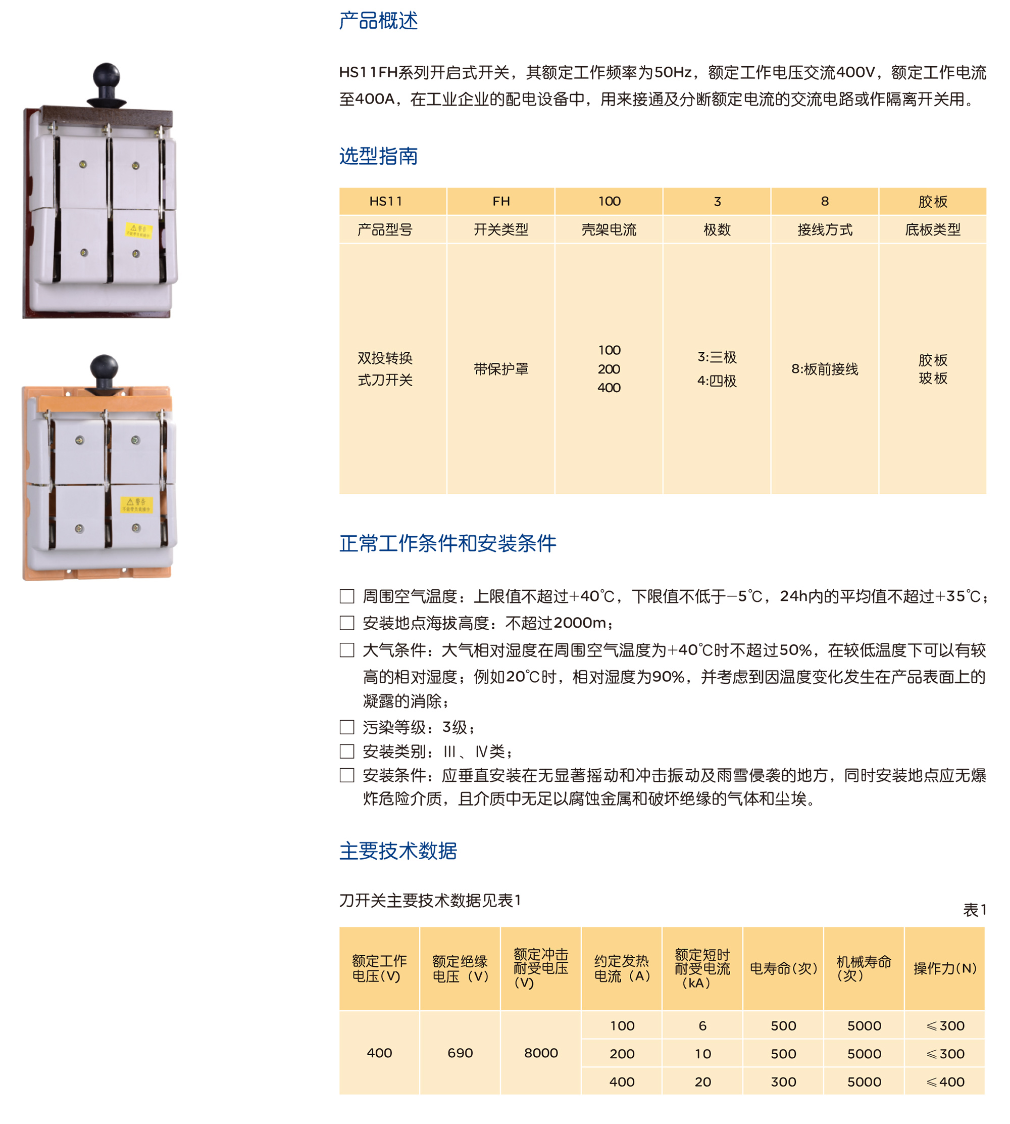 HS11FH系列開啟式開關(guān),其額定工作頻率為50Hz,額定工作電壓交流400V,額定工作電流至400A,在工業(yè)企業(yè)的配電設(shè)備中,用來(lái)接通及分?jǐn)囝~定電流的交流電路或作隔離開關(guān)用。