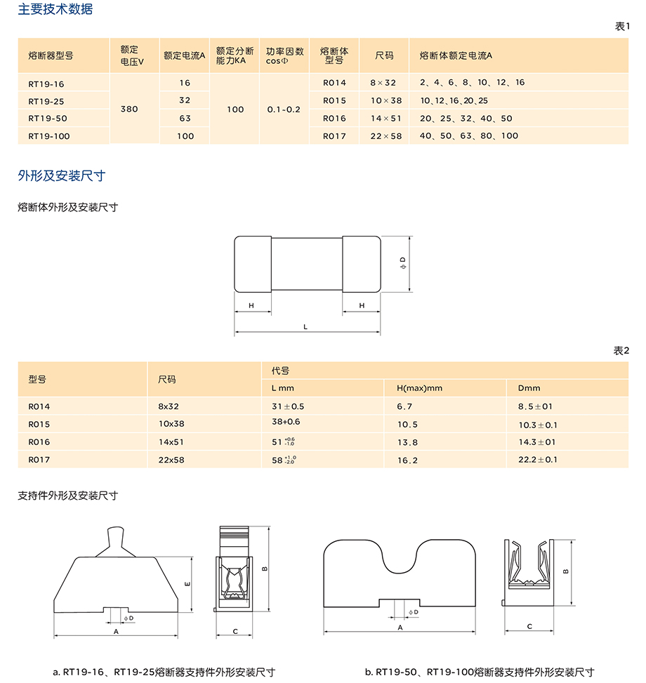 RT19系列有填料封閉管式圓筒形帽熔斷器適用于交流50Hz,額定電壓380V,額定電流至100A的工業(yè)電氣配電裝置中,作線路過載和短路保護之用。 產(chǎn)品符合:GB/T 13539.2 IEC 60269-2 標準。