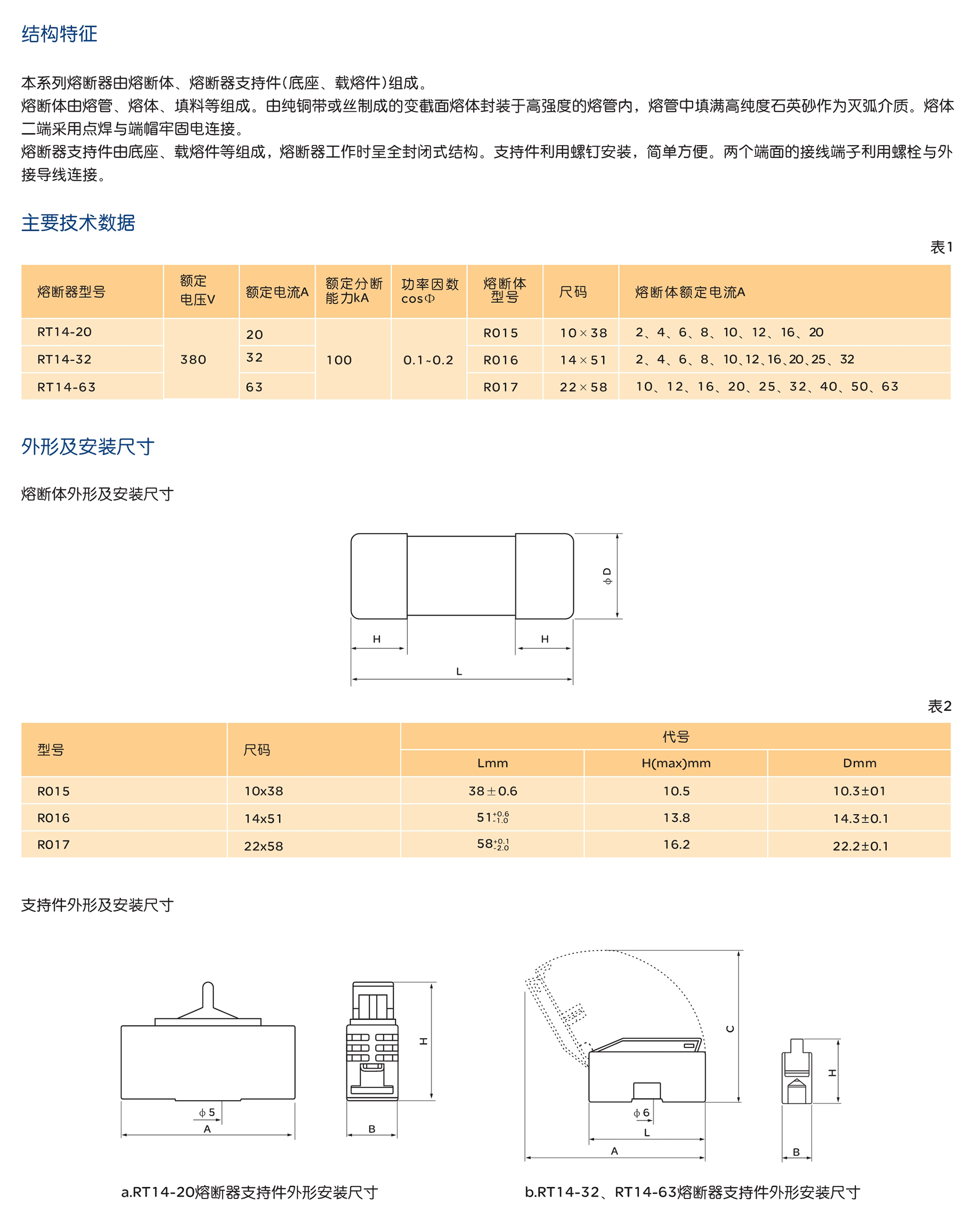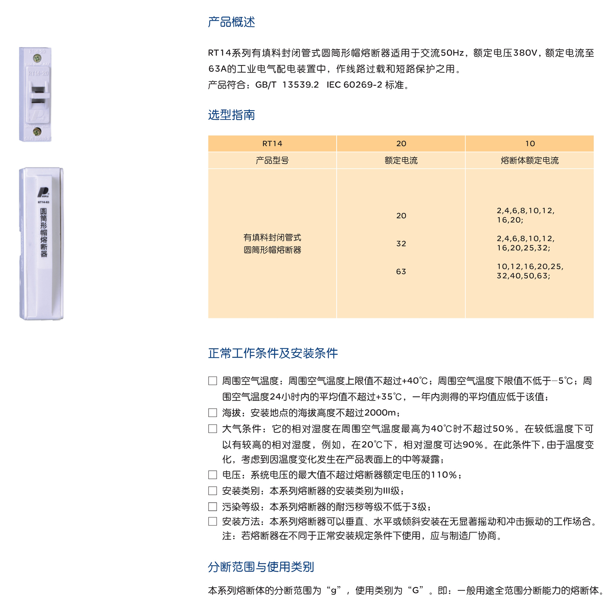 RT14系列有填料封閉管式圓筒形帽熔斷器適用于交流50Hz,額定電壓380V,額定電流至63A的工業(yè)電氣配電裝置中,作線路過(guò)載和短路保護(hù)之用。 產(chǎn)品符合:GB/T 13539.2 IEC 60269-2 標(biāo)準(zhǔn)。