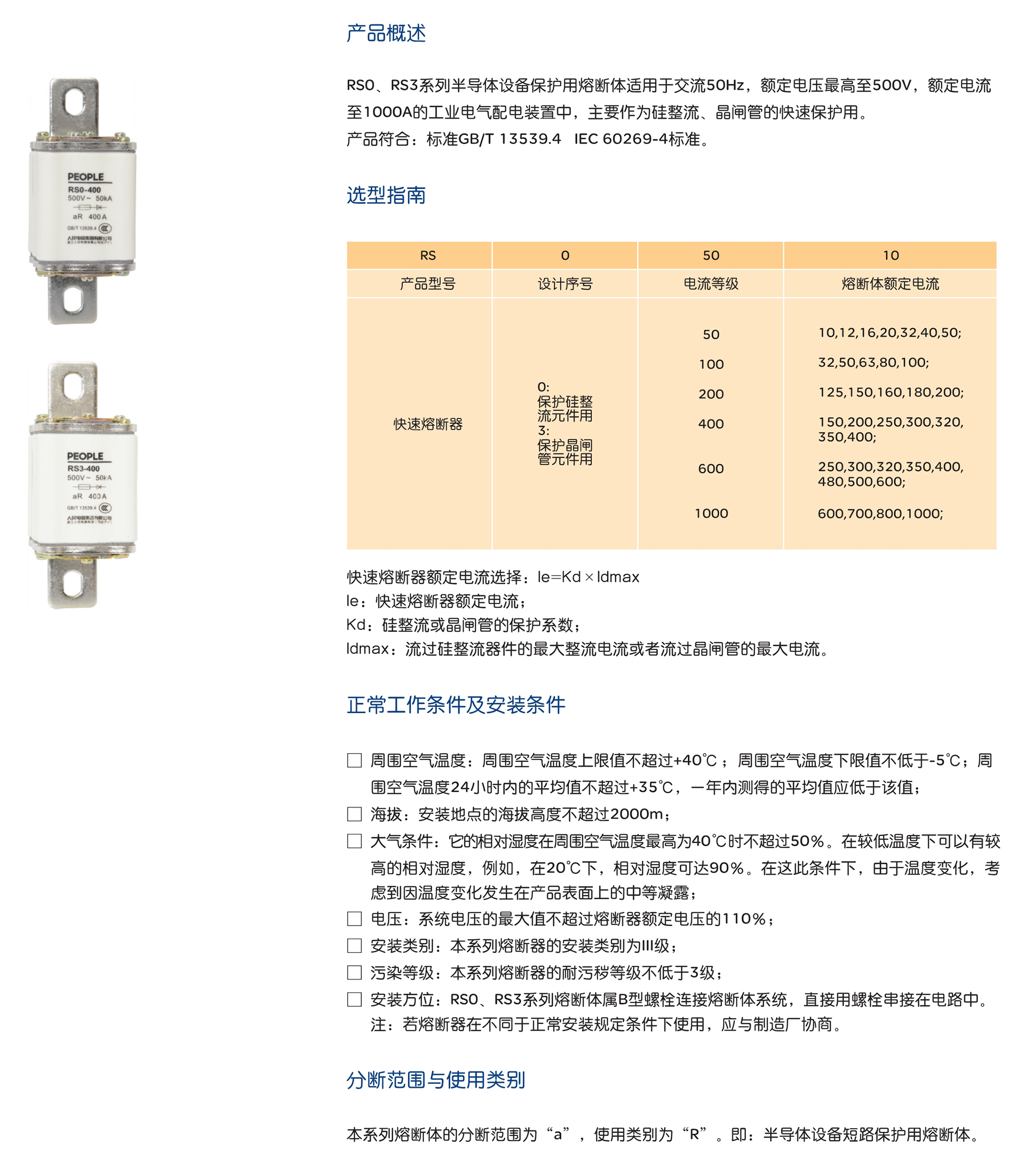 RS0、RS3系列半導(dǎo)體設(shè)備保護用熔斷體適用于交流50Hz,額定電壓最高至500V,額定電流