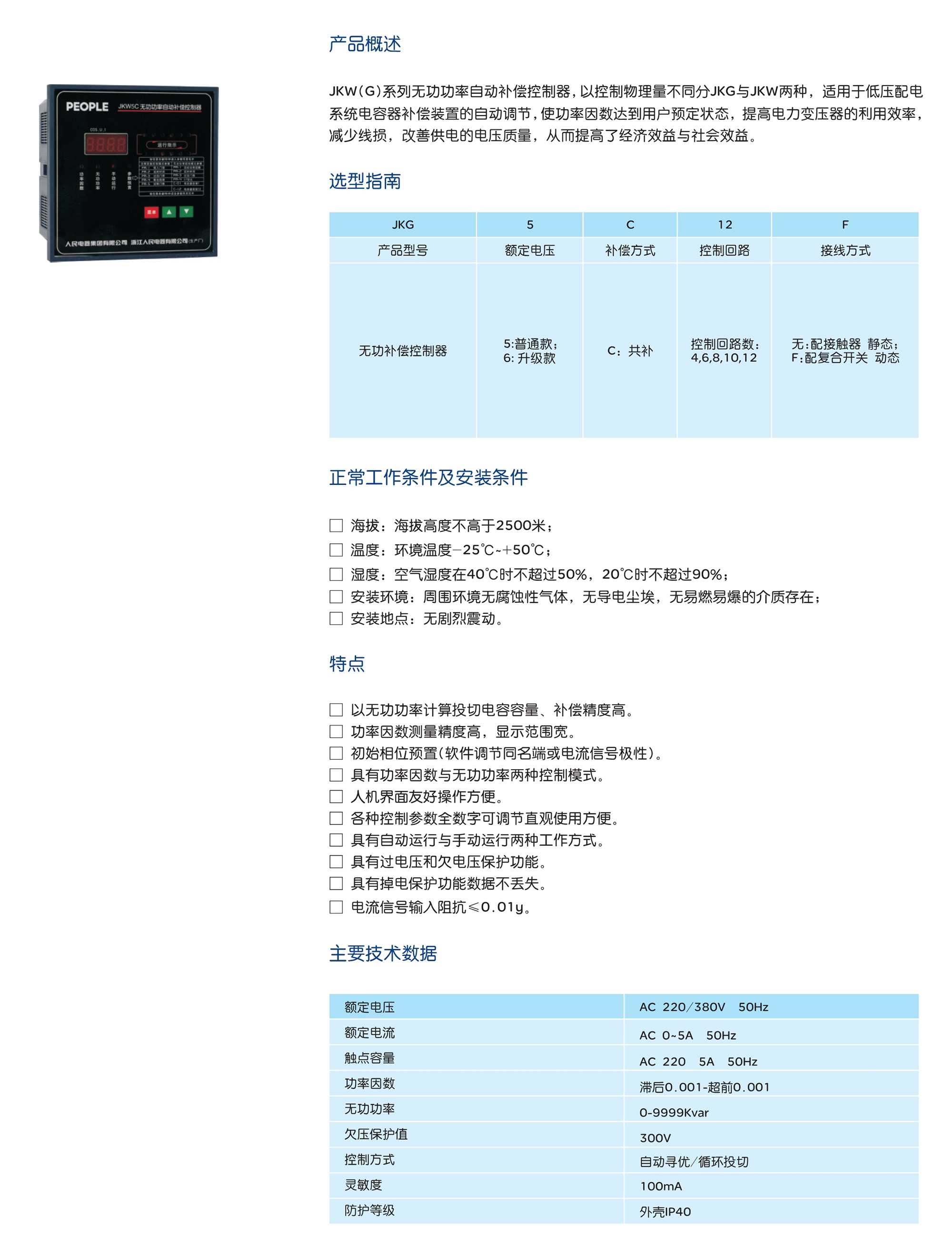 JKW(G)系列無功功率自動補償控制器,以控制物理量不同分JKG與JKW兩種,適用于低壓配電 系統(tǒng)電容器補償裝置的自動調(diào)節(jié),使功率因數(shù)達(dá)到用戶預(yù)定狀態(tài),提高電力變壓器的利用效率, 減少線損,改善供電的電壓質(zhì)量,從而提高了經(jīng)濟(jì)效益與社會效益。