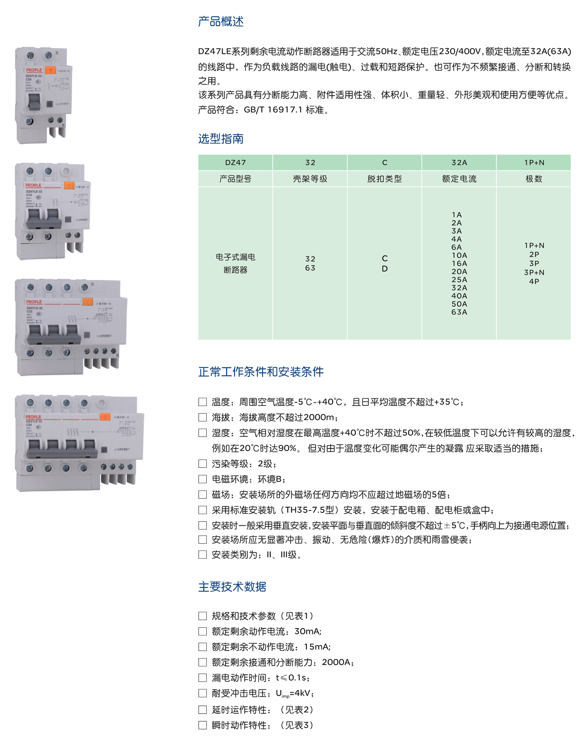 DZ47LE系列剩余電流動(dòng)作斷路器適用于交流50Hz、額定電壓230/400V,額定電流至32A(63A)