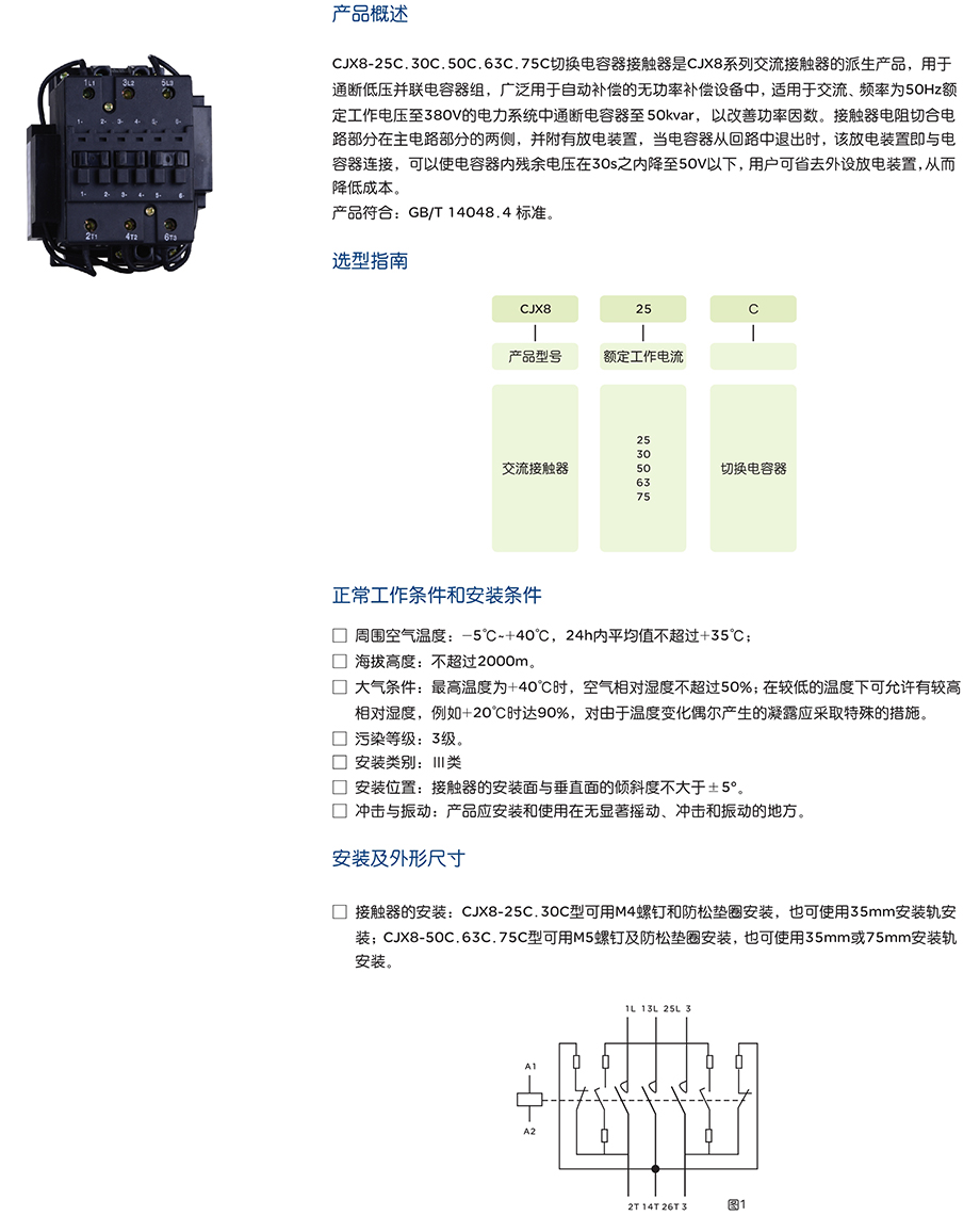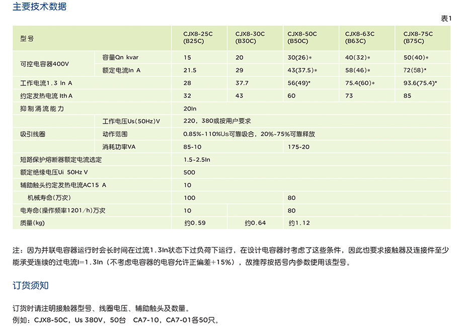 CJX8-25C.30C.50C.63C.75C切換電容器接觸器是CⅨ8系列交流接觸器的派生產(chǎn)品,用于通斷低壓并聯(lián)電容器組,廣泛用于自動補償?shù)臒o功率補償設(shè)備中,適用于交流、頻率為50Hz額定工作電壓至380V的電力系統(tǒng)中通斷電容器至50Kvar,以改善功率因數(shù)。接觸器電阻切合電路部分在主電路部分的兩側(cè),并附有放電裝置,當(dāng)電容器從回路中退出時,該放電裝置即與電容器連接,可以使電容器內(nèi)殘余電壓在30s之內(nèi)降至50V以下,用戶可省去外設(shè)放電裝置,從而低成本。