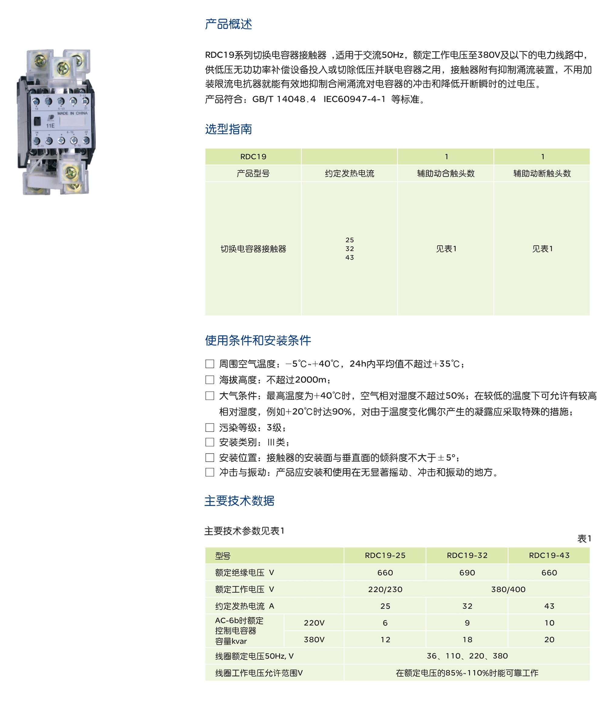 RDC19系列切換電容器接觸器,適用于交流50Hz額定電源電壓至660V及以下的電力線路中供低壓無功功率補(bǔ)償設(shè)備投入或切除低壓并聯(lián)電容器之用,接觸器附有抑制涌流裝置,不用加裝限流電抗器就能有效地抑制合閘涌流對(duì)電容器的沖擊和降低開斷瞬時(shí)的過電壓產(chǎn)品符合:GB/T14048.4 IEC60947-4-1等標(biāo)準(zhǔn)。
