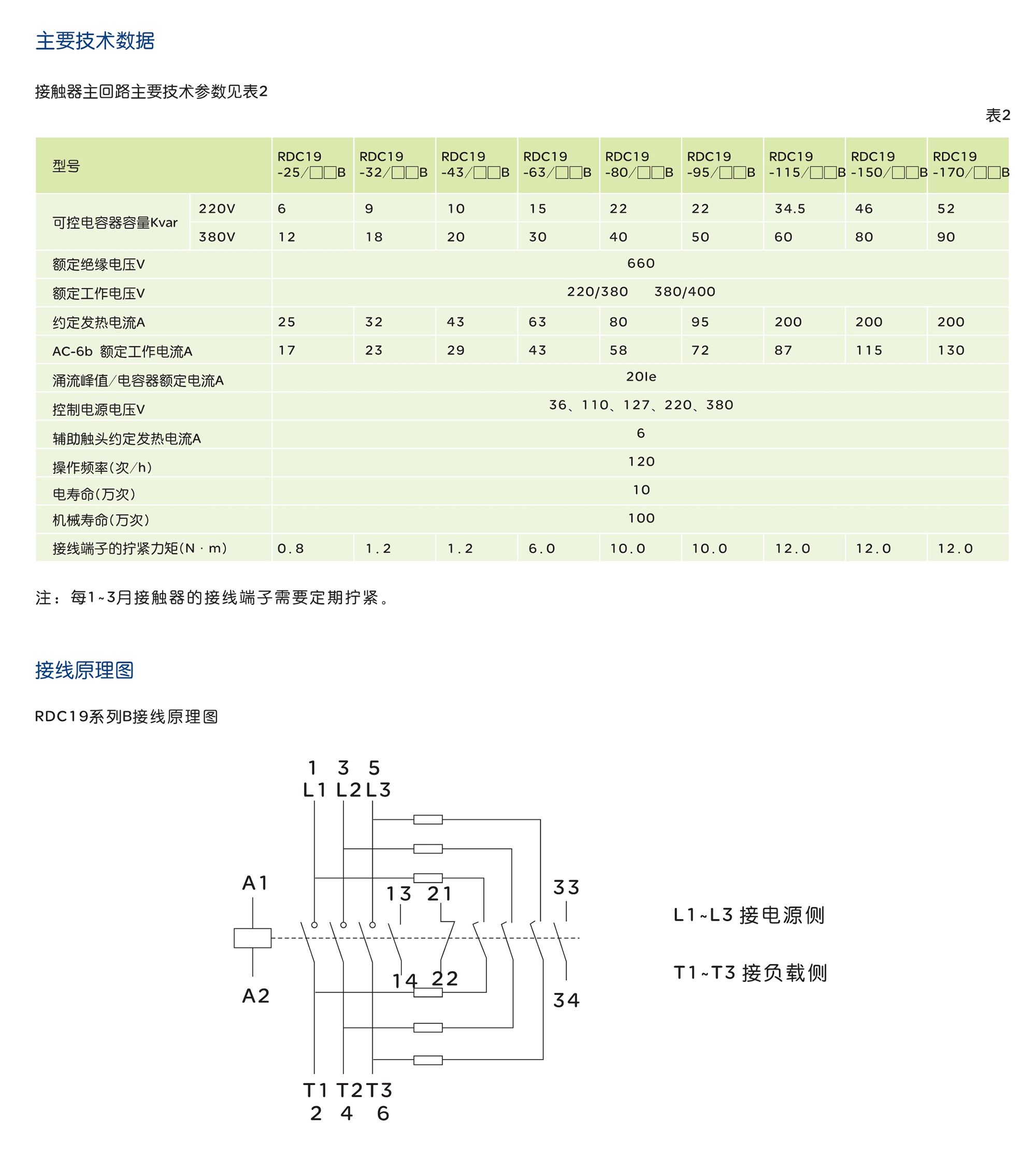 RDC19系列B切換電容器接觸器,適用于交流50Hz(或60Hz),額定電源電壓至660V及以下的 電力線路中,供低壓無功功率補償設備投入或切除低壓并聯(lián)電容器之用,接觸器附有抑制涌流 裝置,不用加裝限流電抗器就能有效抑制合閘涌流對電容器的沖擊和降低開斷瞬時的過電壓。 產(chǎn)品符合:GB/T 14048.4 IEC60947-4-1 等標準。