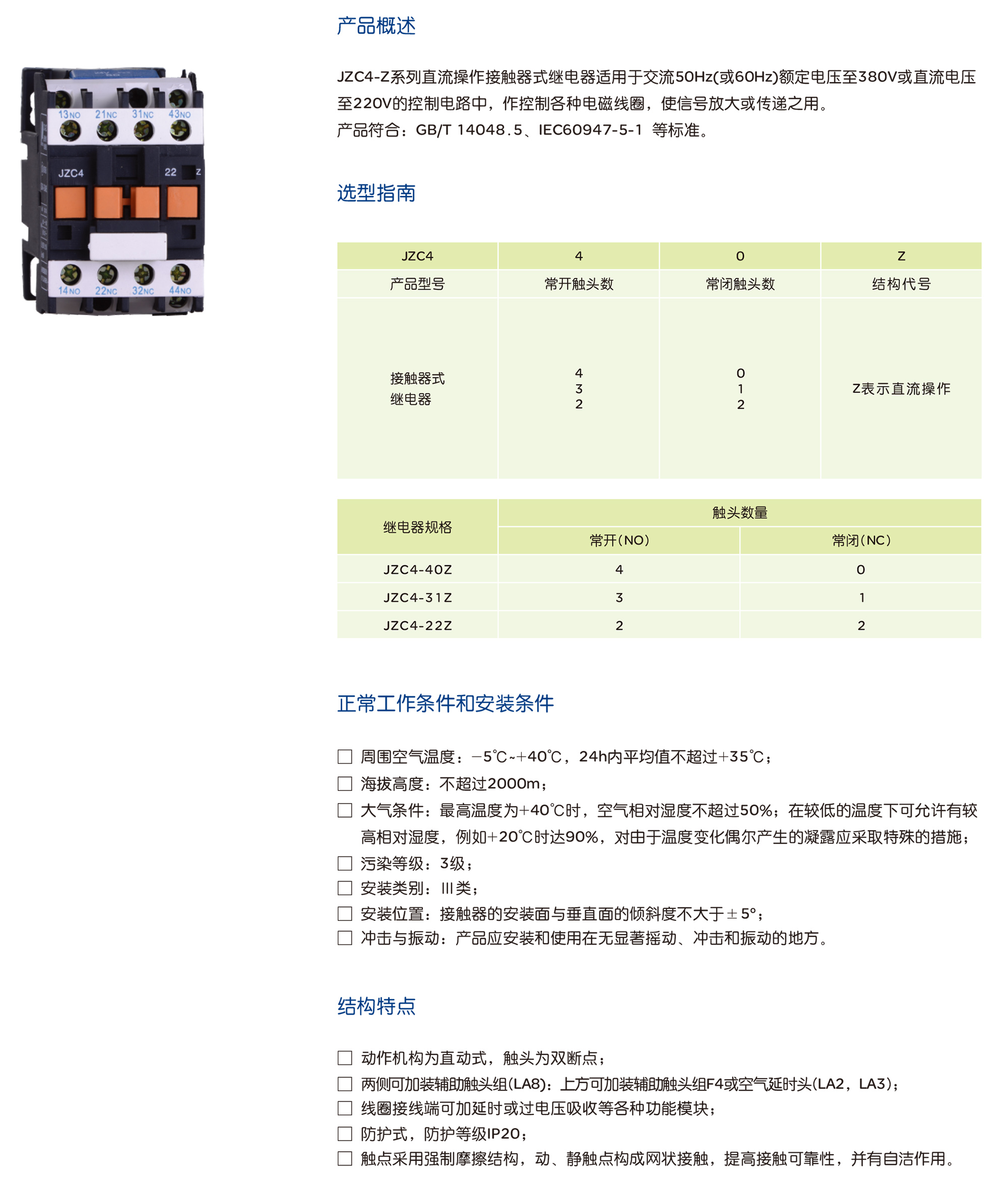 JZC4-Z系列直流操作接觸器式繼電器適用于交流50Hz(或60Hz)額定電壓至380V或直流電壓至220V的控制電路中,作控制各種電磁線圈,使信號放大或傳遞之用品符合:GB/T14048.5、IEC60947-5-1等標(biāo)準(zhǔn)。