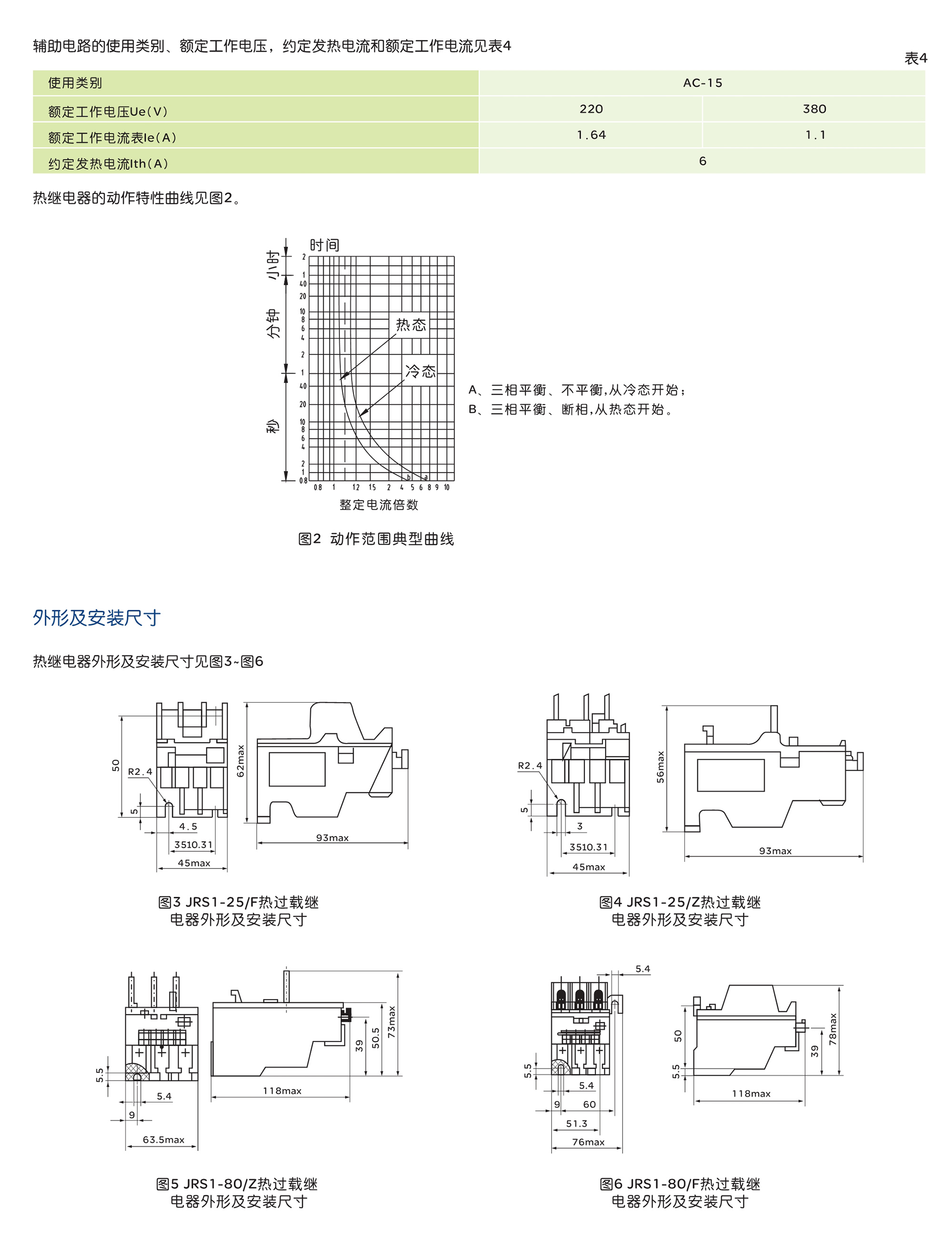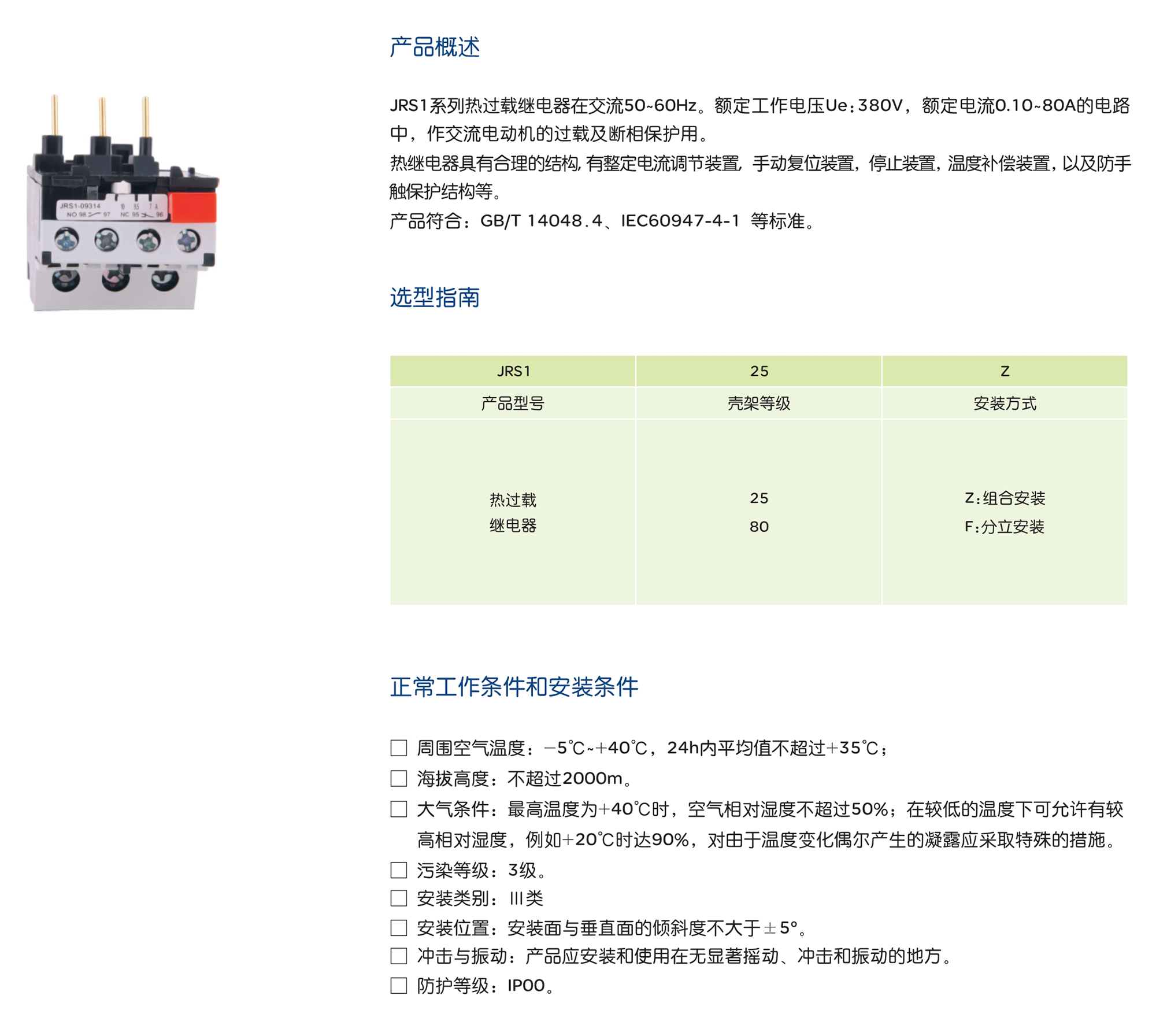 JRS1系列熱過載繼電器在交流50~60Hz。額定工作電壓Ue:380V,額定電流0.10~80A的電路 中,作交流電動機的過載及斷相保護用。 熱繼電器具有合理的結構, 有整定電流調(diào)節(jié)裝置, 手動復位裝置,停止裝置,溫度補償裝置,以及防手 觸保護結構等。 產(chǎn)品符合:GB/T 14048.4、IEC60947-4-1 等標準。