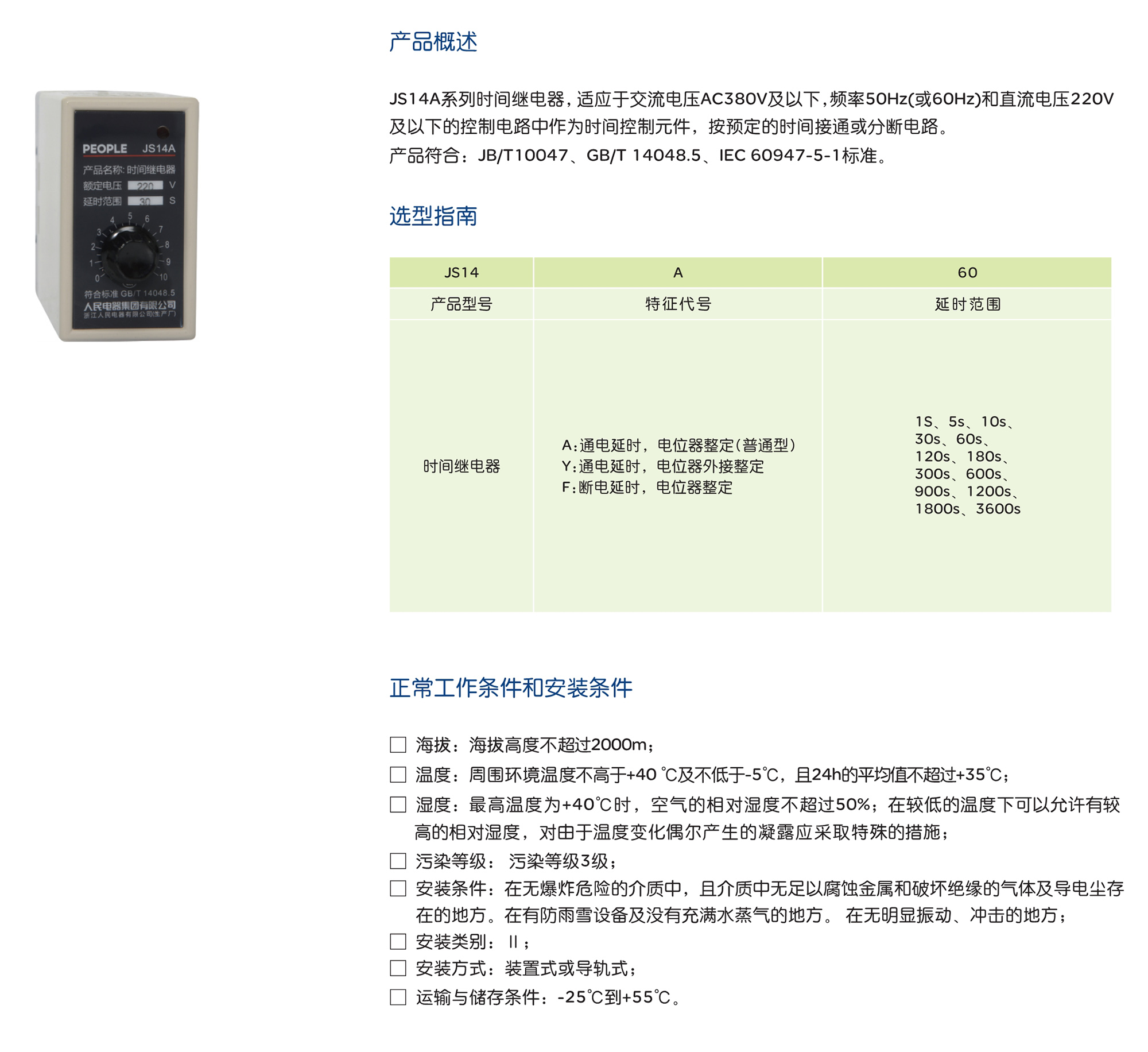 JS14A系列時間繼電器,適應于交流電壓AC380V及以下,頻率50Hz(或60Hz)和直流電壓220V 及以下的控制電路中作為時間控制元件,按預定的時間接通或分斷電路。 產品符合:JB/T10047、GB/T 14048.5、IEC 60947-5-1標準。