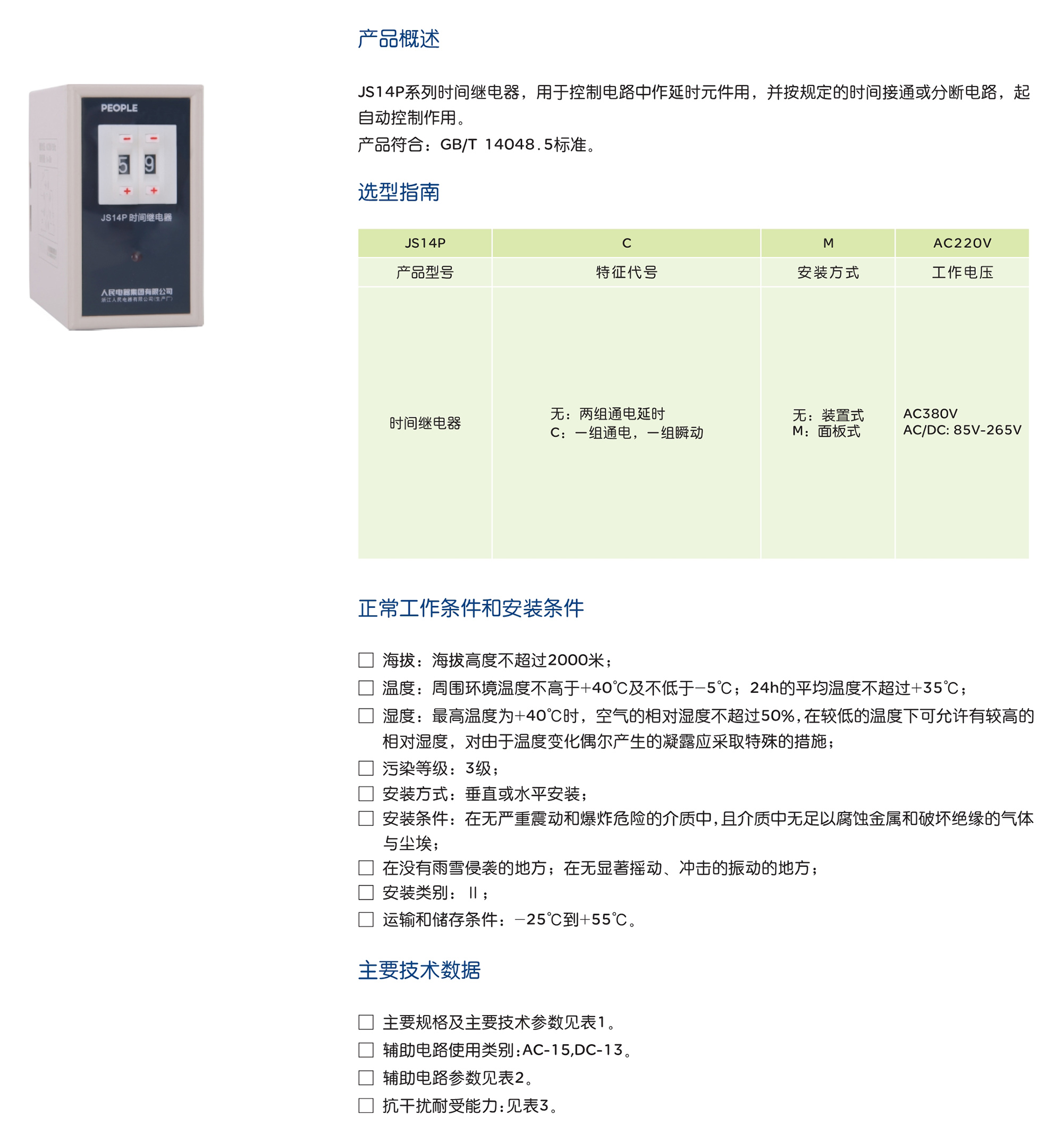 JS14P系列時間繼電器,用于控制電路中作延時元件用,并按規(guī)定的時間接通或分斷電路,起 自動控制作用。 產(chǎn)品符合:GB/T 14048.5標準。