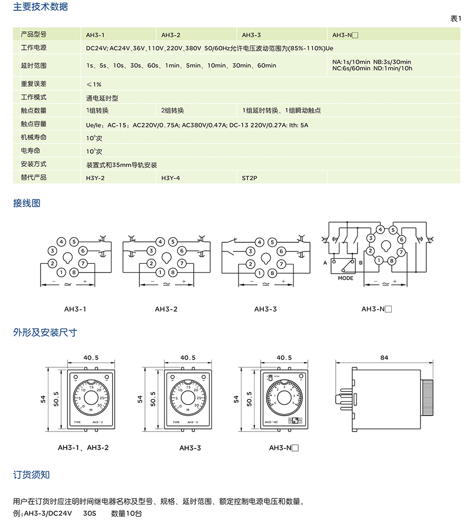 AH3系列時間繼電器,用于交流50Hz電壓至380V和直流電壓至110V的自動控制電路中,可 按預定的時間接通和分斷電路,在電力拖動、程序控制以及各種生產過程的自動控制等系統(tǒng) 中起時間控制作用。 產品符合:JB/T10047、GB/T 14048.5、IEC60947-5-1標準。