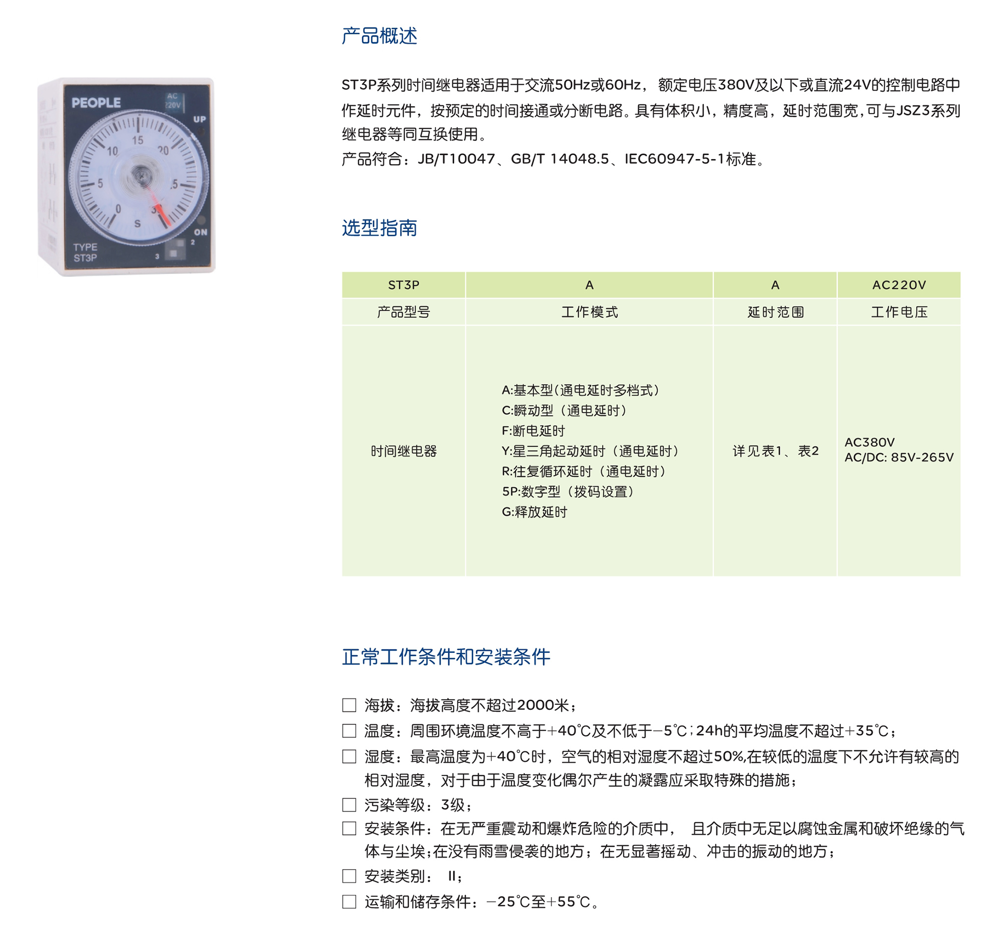ST3P系列時(shí)間繼電器適用于交流50Hz或60Hz,額定電壓380V及以下或直流24V的控制電路中作廷時(shí)元件,按預(yù)定的時(shí)間接通或分?jǐn)嚯娐?。具有體積小,精度高,延時(shí)范圍寬,可與JSZ3系列繼電器等同互換使用。 產(chǎn)品符合:JB/T10047、GB/T14048.5、IEC60947-5-1標(biāo)準(zhǔn)。