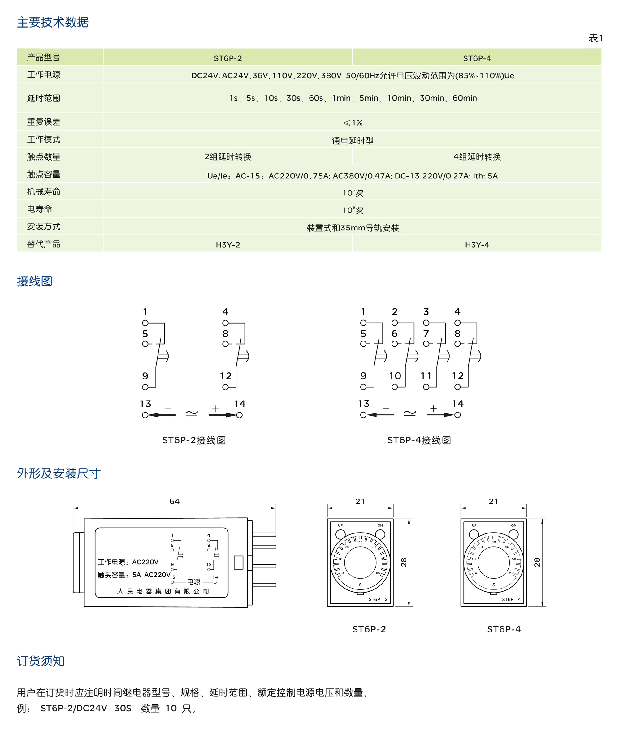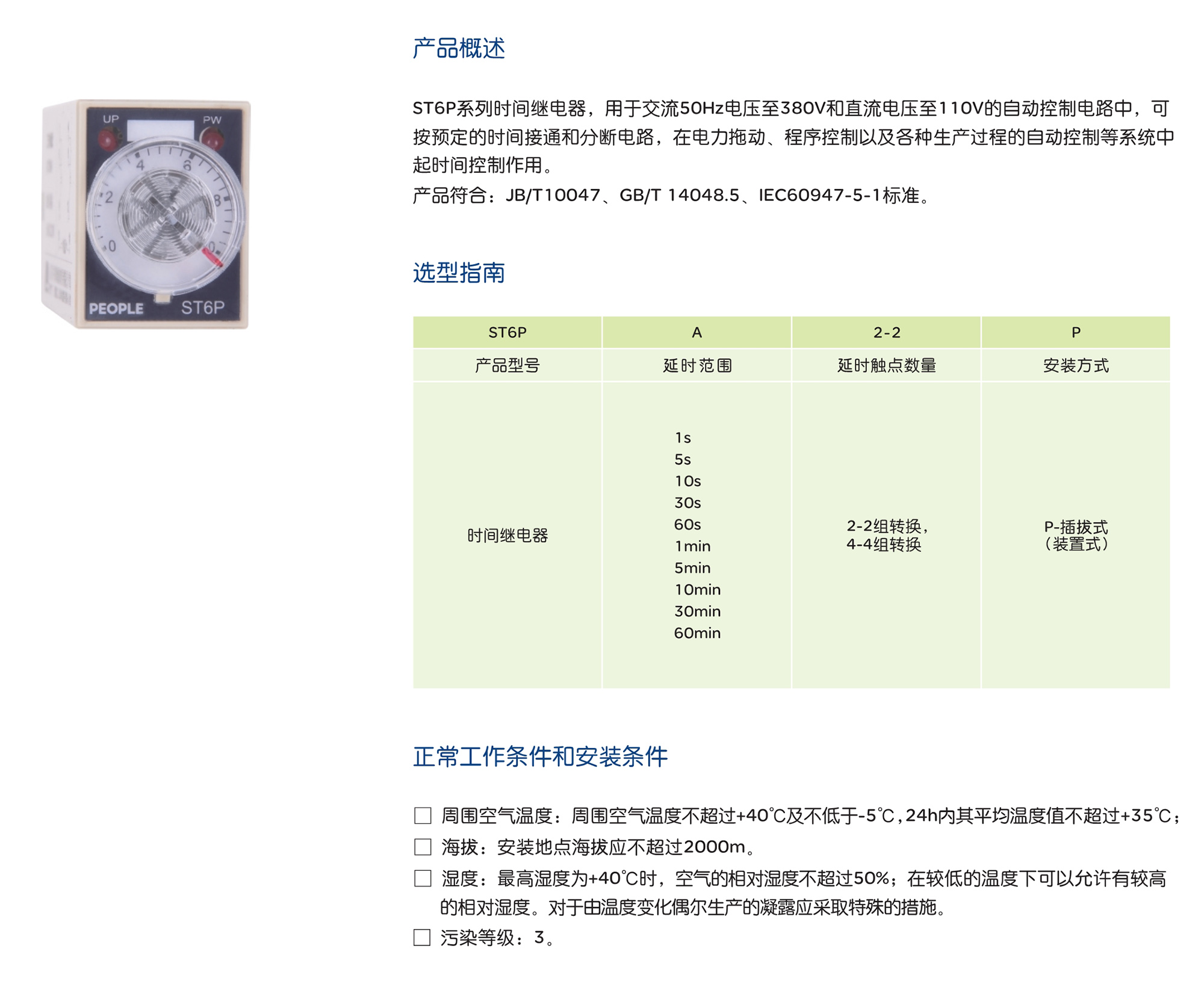 ST6P系列時間繼電器,用于交流50Hz電壓至380V和直流電壓至110V的自動控制電路中,可 按預(yù)定的時間接通和分?jǐn)嚯娐?,在電力拖動、程序控制以及各種生產(chǎn)過程的自動控制等系統(tǒng)中 起時間控制作用。 產(chǎn)品符合:JB/T10047、GB/T 14048.5、IEC60947-5-1標(biāo)準(zhǔn)。