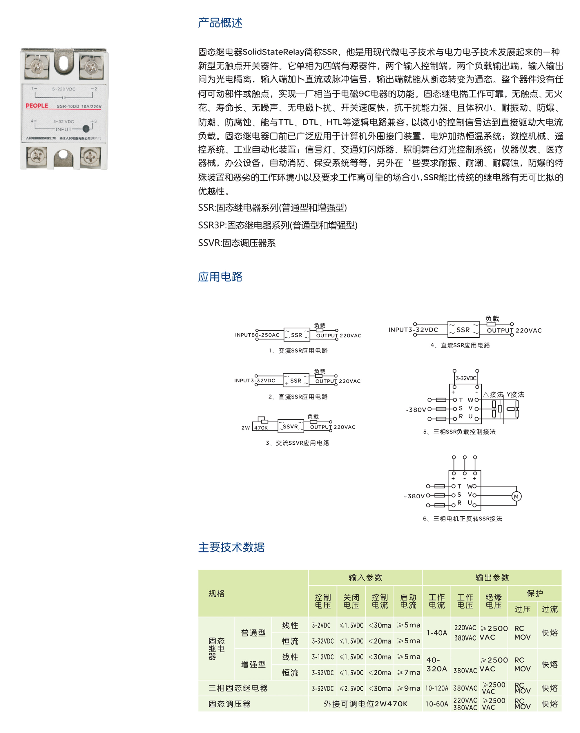固態(tài)繼電器SolidStateRelay簡稱SSR,他是用現(xiàn)代微電子技術(shù)與電力電子技術(shù)發(fā)展起來的一種新型無觸點(diǎn)開關(guān)器件。它單相為四端有源器件,兩個輸入控制端,兩個負(fù)載輸出端,輸入輸出問為光電隔離,輸入端加卜直流或脈沖信號,輸出端就能從斷態(tài)轉(zhuǎn)變?yōu)橥☉B(tài)。整個器件沒有任何可動部件或觸點(diǎn),實(shí)現(xiàn)—廠相當(dāng)于電磁9C電器的功能。固態(tài)繼電揣工作可靠,無觸點(diǎn)、無火花、壽命長、無噪聲、無電磁卜擾、開關(guān)速度快,抗干擾能力強(qiáng)、且體積小、耐振動、防爆、防潮、防腐蝕、能與TTL、DTL、HTL等邏輯電路