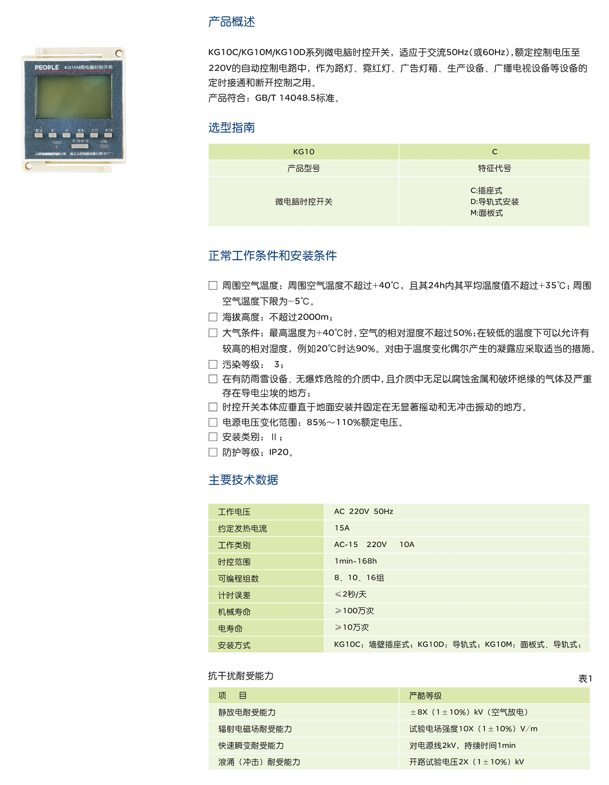 KG10C/KG10M/KG10D系列微電腦時(shí)控開關(guān),適應(yīng)于交流50Hz(或60Hz),額定控制電壓至220V的自動(dòng)控制電路中,作為路燈、霓紅燈、廣告燈箱、生產(chǎn)設(shè)備、廣播電視設(shè)備等設(shè)備的定時(shí)接通和斷開控制之用。 產(chǎn)品符合:GB/T14048.5標(biāo)準(zhǔn)。