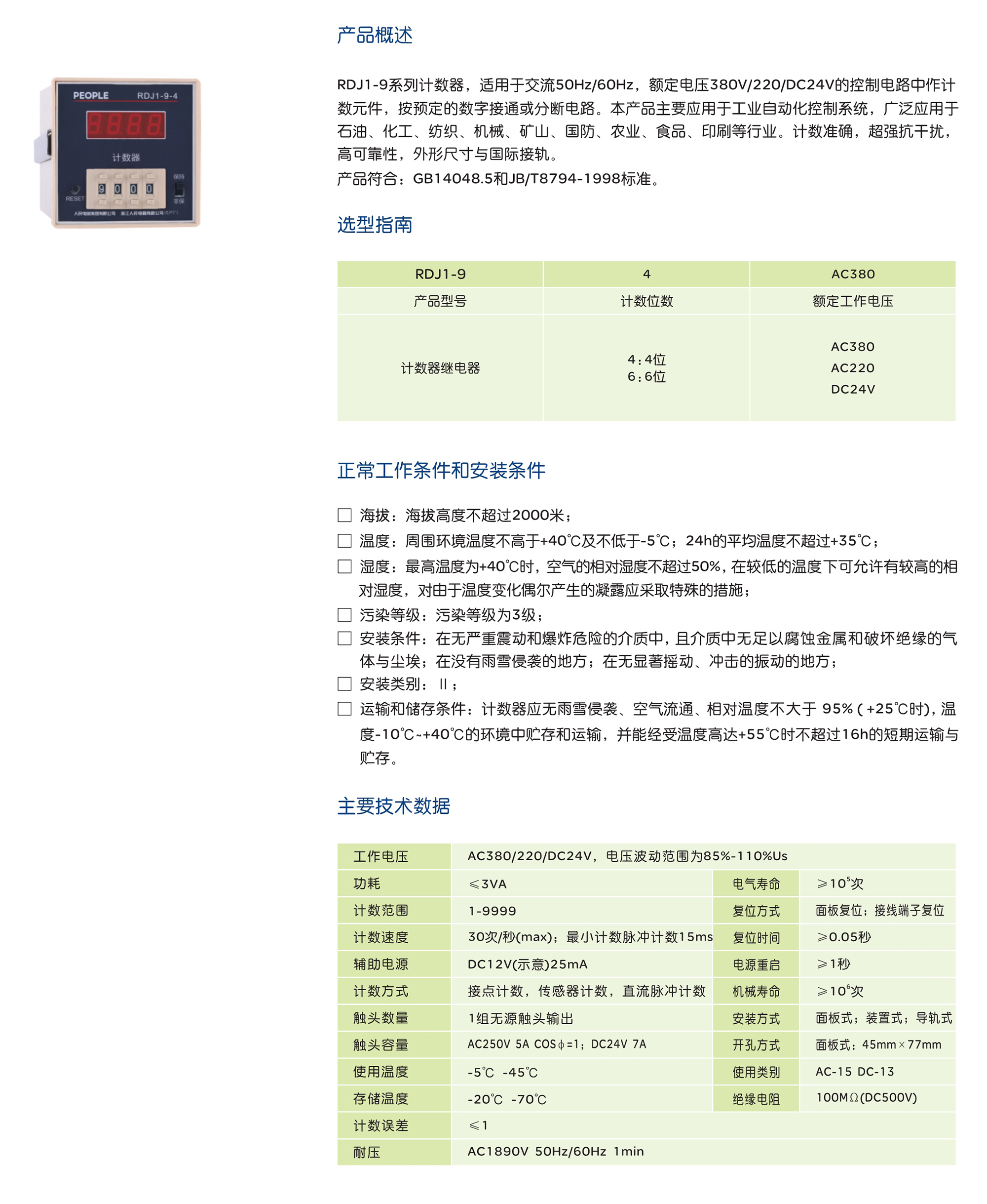 RDJ1-9系列計數(shù)器,適用于交流50Hz/60Hz,額定電壓380V/220/DC24V的控制電路中作計