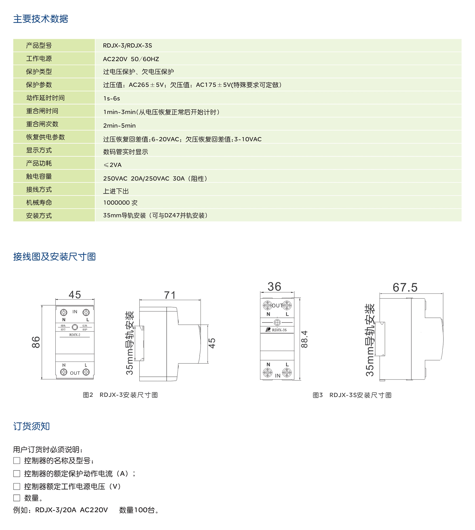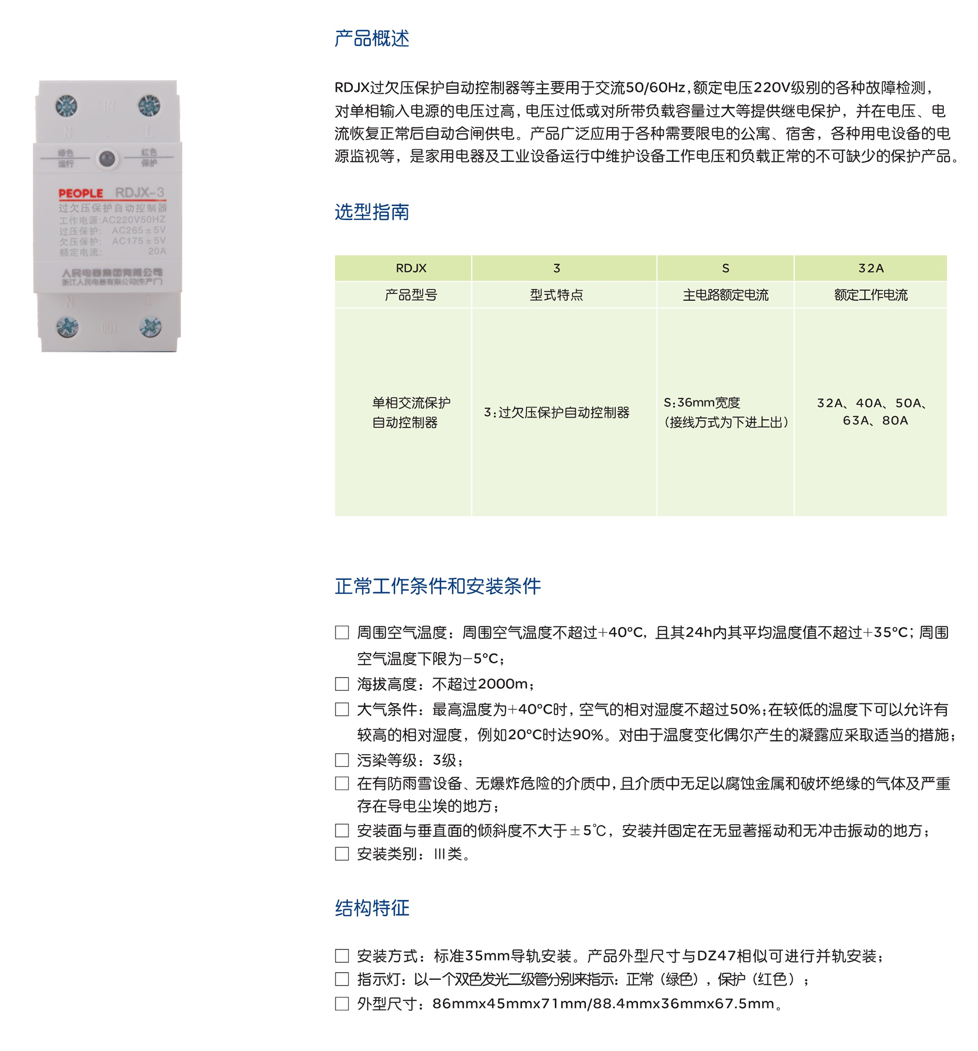 RDJX過欠壓保護自動控制器等主要用于交流50/60Hz,額定電壓220V級別的各種故障檢測,對單相輸入電源的電壓過高,電壓過低或對所帶負載容量過大等提供繼電保護,并在電壓、電流恢復正常后自動合閘供電。產(chǎn)品廣泛應用于各種需要限電的公寓、宿舍,各種用電設備的電源監(jiān)視等,是家用電器及工業(yè)設備運行中維護設備工作電壓和負載正常的不可缺少的保護產(chǎn)品。