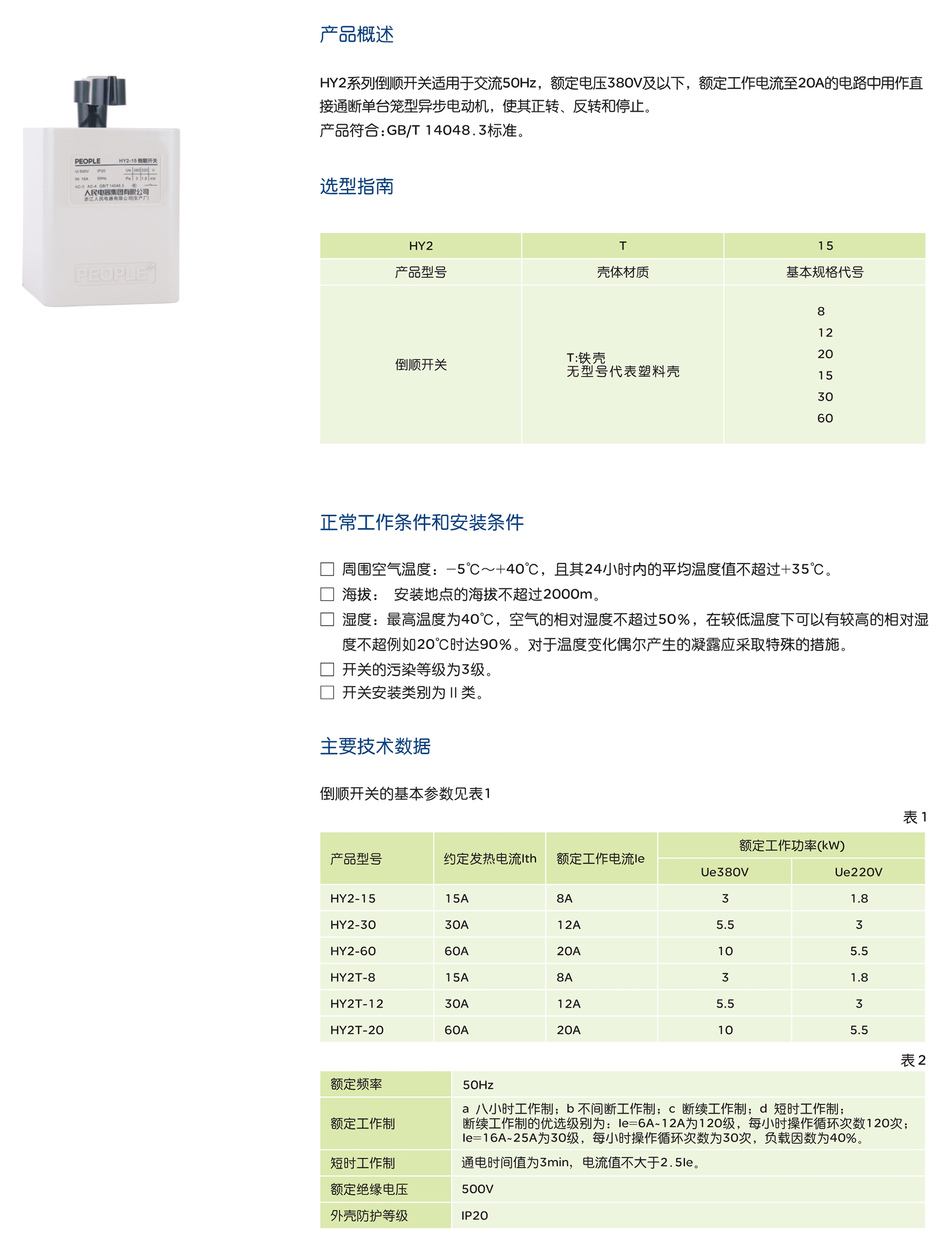 HY2系列倒順開關(guān)適用于交流50Hz,額定電壓380V及以下,額定工作電流至20A的電路中用作直 接通斷單臺(tái)籠型異步電動(dòng)機(jī),使其正轉(zhuǎn)、反轉(zhuǎn)和停止。 產(chǎn)品符合:GB/T 14048.3標(biāo)準(zhǔn)。