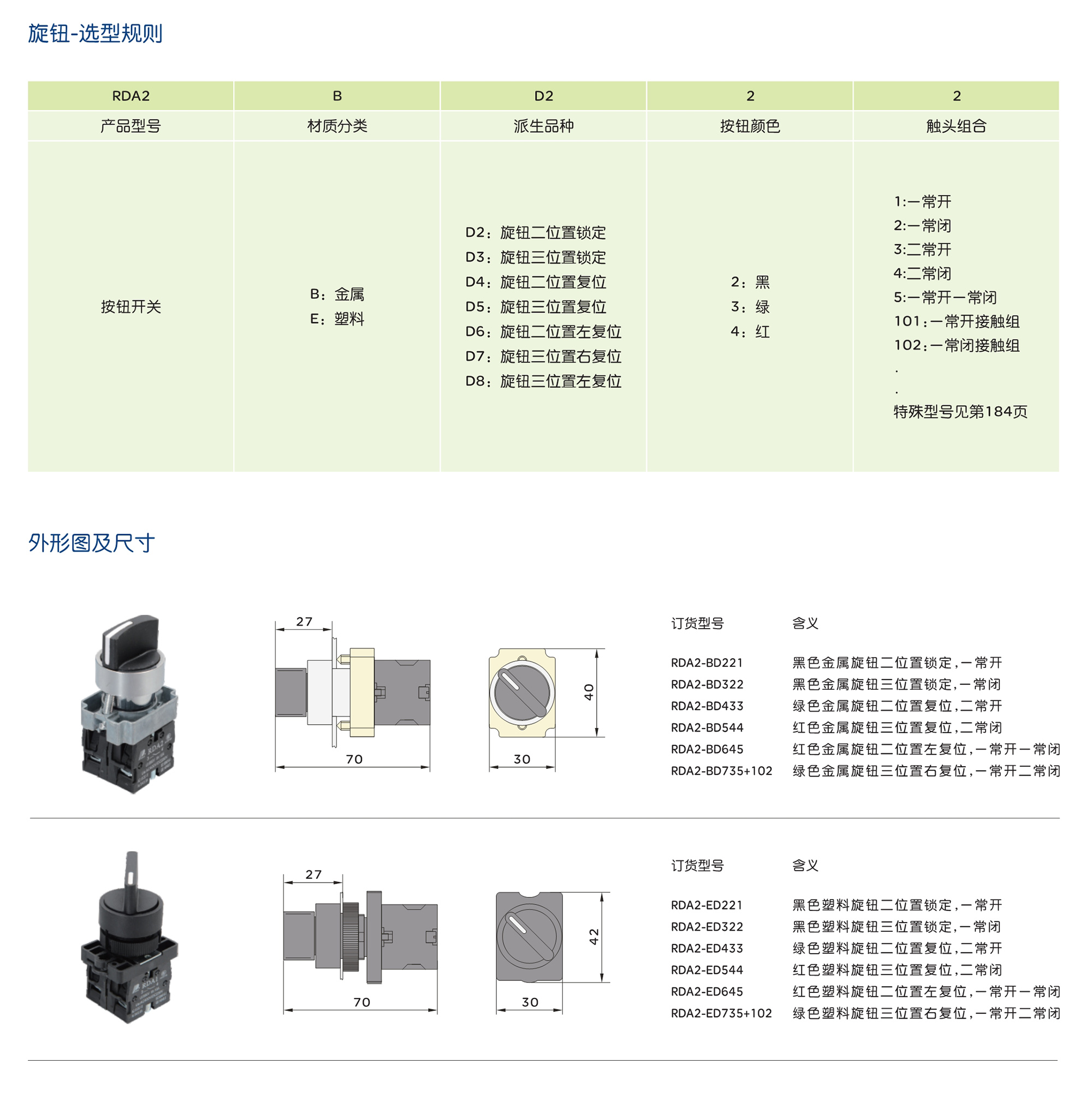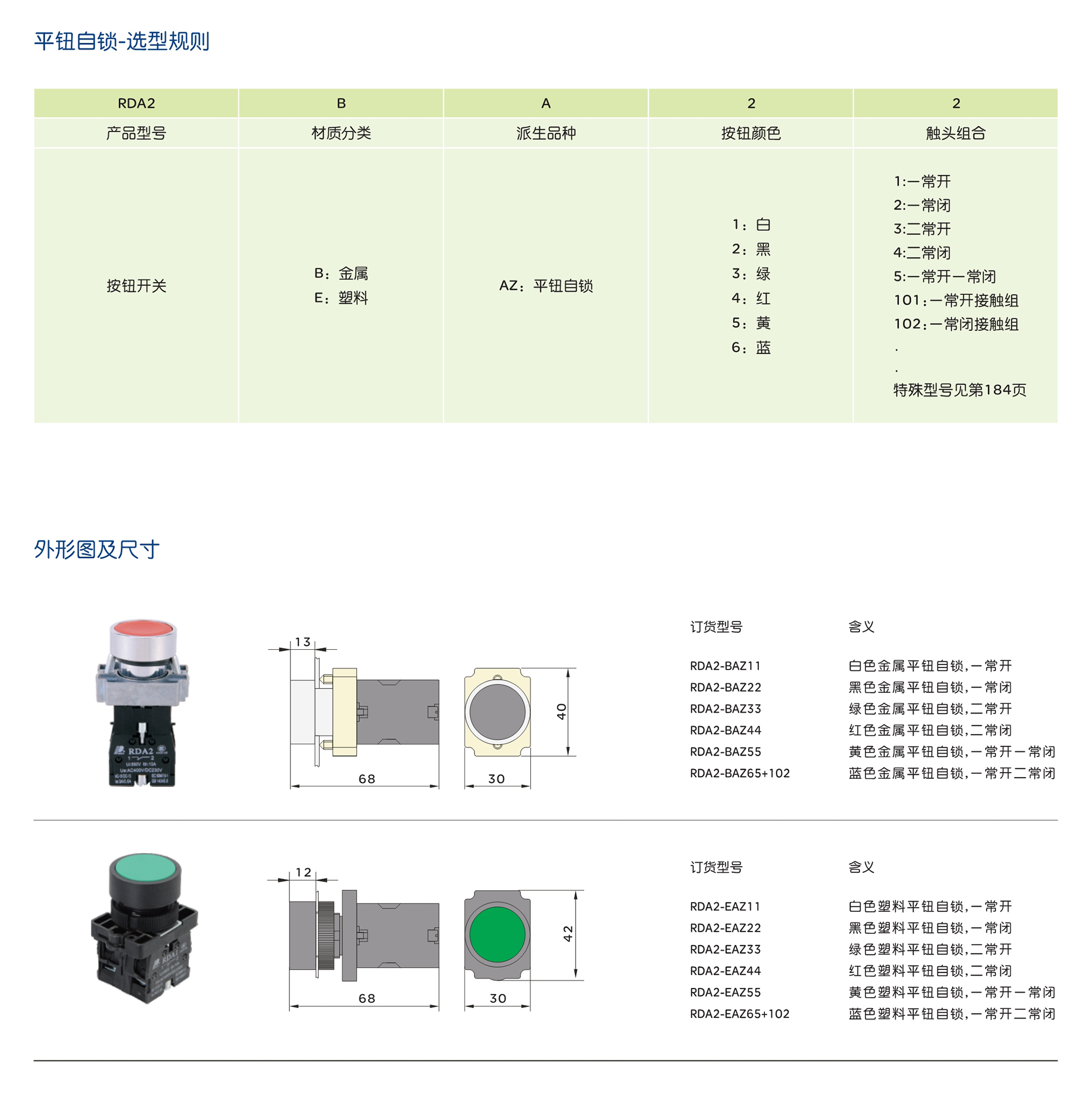 RDA2按鈕開(kāi)關(guān)適用于交流50(60)Hz、額定工作電壓380V或直流 電壓220V的控制電路中,作為控制接觸器、繼電器、電磁開(kāi)關(guān)或工作信號(hào)轉(zhuǎn) 換之用。帶信號(hào)燈的按鈕,信號(hào)燈裝在按鈕的頸部,鈕頭兼作信號(hào)燈的燈罩,用不同的顏色作區(qū)別信號(hào)之用。