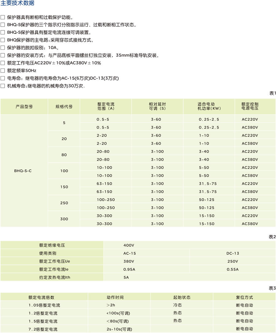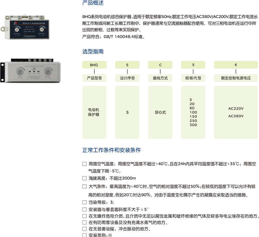 BHQ系列電動(dòng)機(jī)綜合保護(hù)器,適用于額定頻率50Hz額定工作電壓AC380V/AC200V額定工作電流長期工作制或間斷工長期工作制中,保護(hù)器通常與交流接觸器配合使用,可對(duì)三相電動(dòng)機(jī)在運(yùn)行中所出現(xiàn)的斷相、過載等來實(shí)現(xiàn)保護(hù)