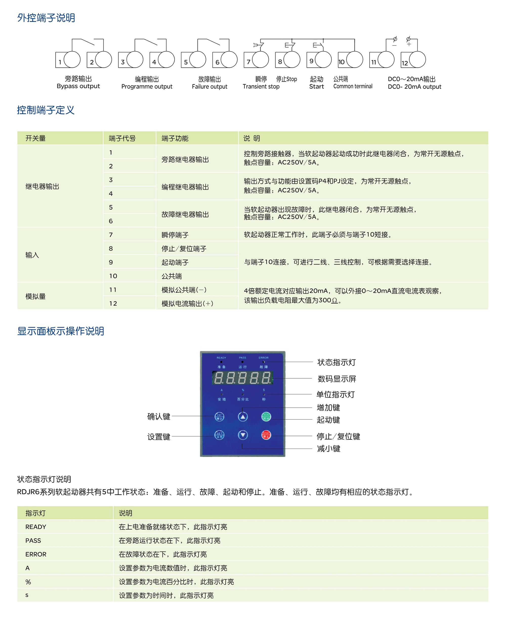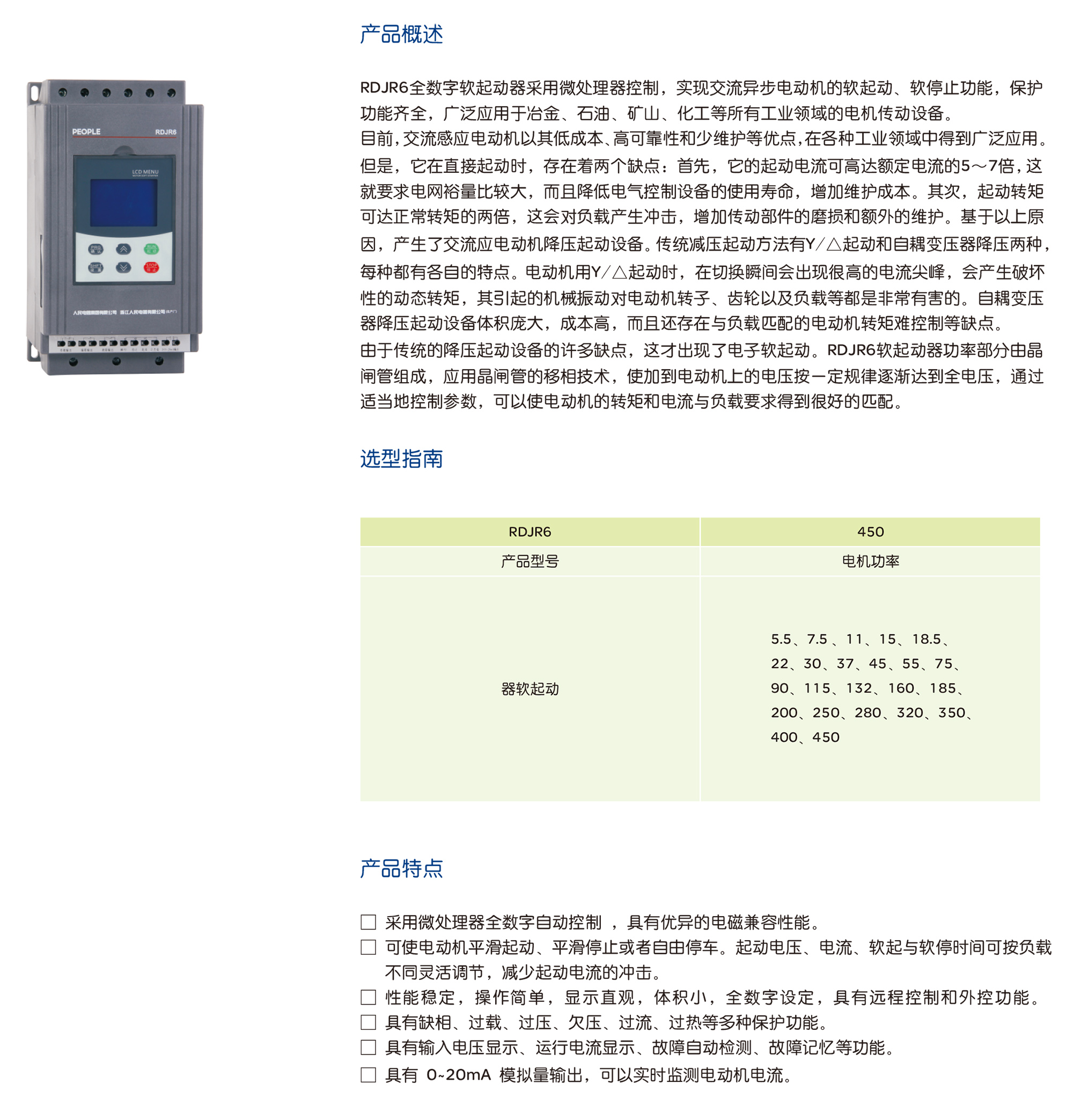 RDJR6全數(shù)字軟起動(dòng)器采用微處理器控制,實(shí)現(xiàn)交流異步電動(dòng)機(jī)的軟起動(dòng)、軟停止功能,保護(hù)
