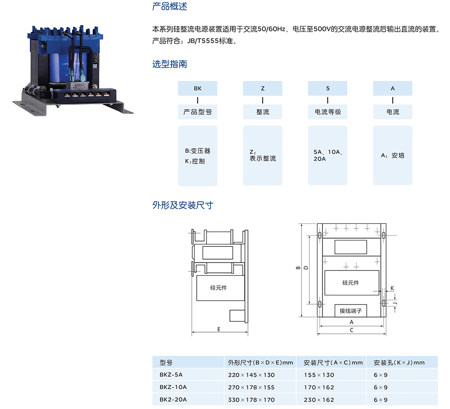 本系列硅整流電源裝置適用于交流50/60Hz、電壓至500V的交流電源整流后輸出直流的裝置。 產(chǎn)品符合:JB/T5555標(biāo)準(zhǔn)。