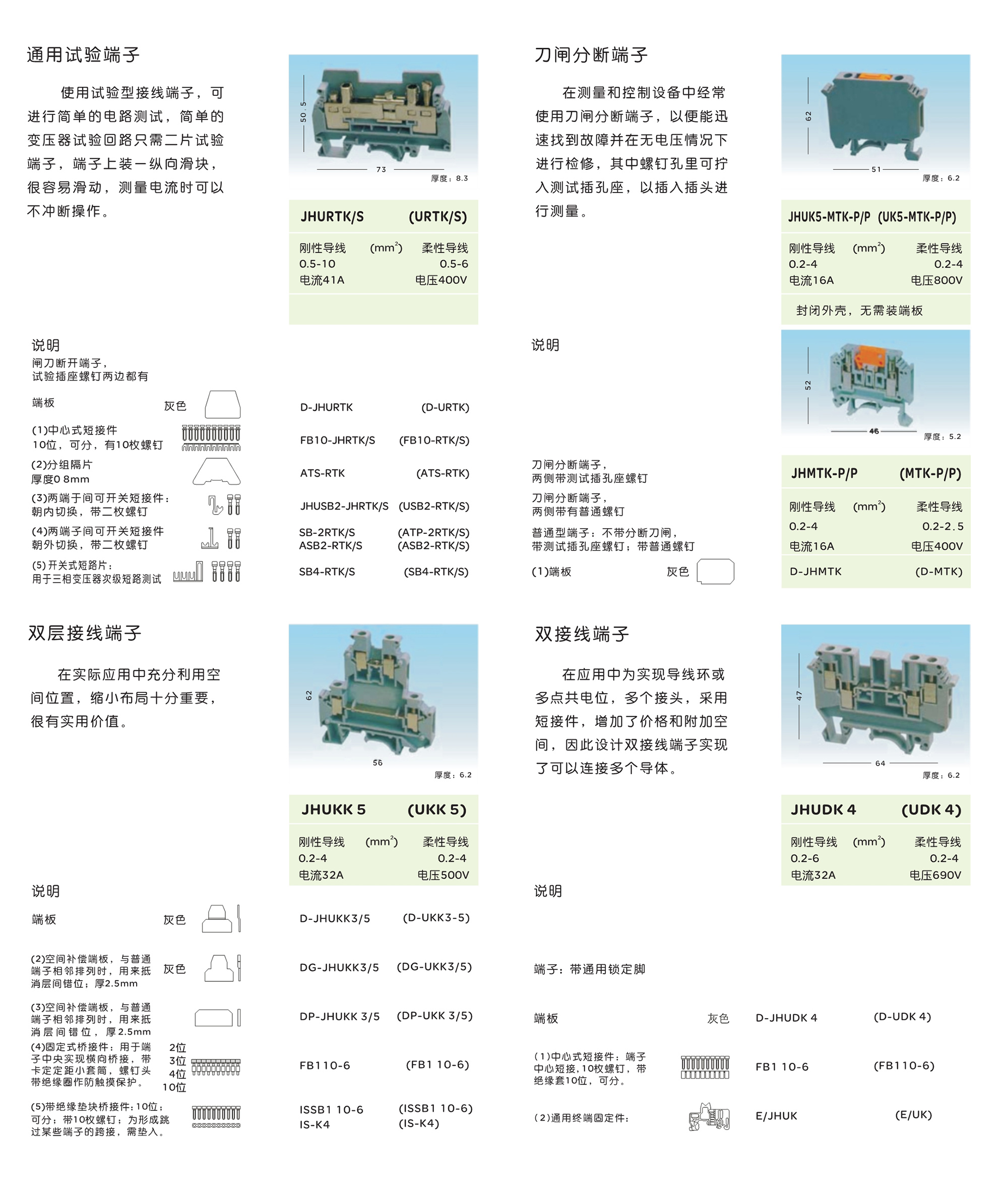 JHUK系列組合端子排采用框式螺釘接線結(jié)構(gòu),設(shè)計(jì)符合IEC60947-1、GB14048等標(biāo)準(zhǔn),產(chǎn) 品用于交流50Hz(60Hz),額定電壓660V、直流440V以下電路額定截面為0.75-150mm2的 連接導(dǎo)線,也適用于未經(jīng)過特殊加工或壓接管狀端頭的圓銅導(dǎo)線連接之用。