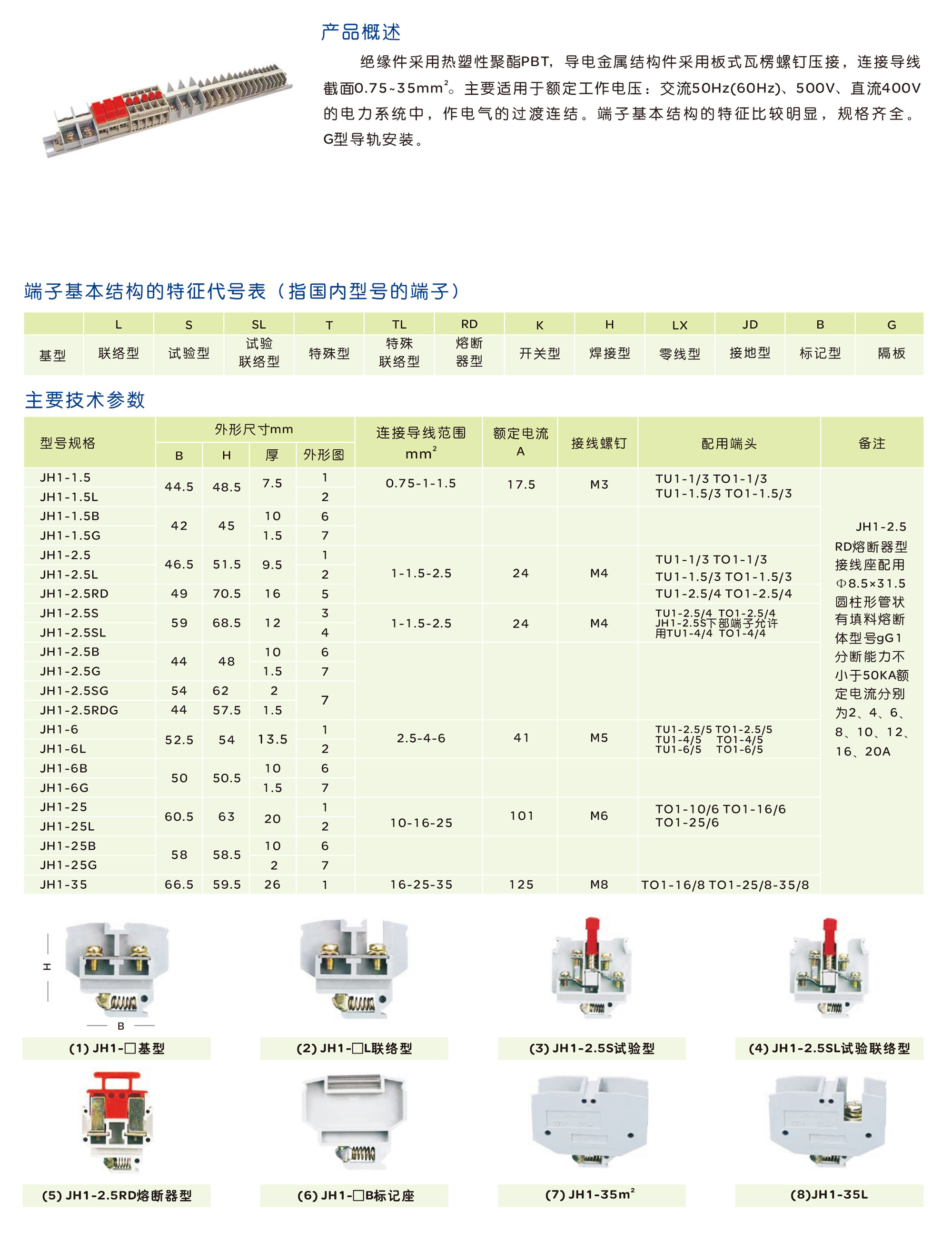 絕緣件采用熱塑性聚酯PBT,導(dǎo)電金屬結(jié)構(gòu)件采用板式瓦楞螺釘壓接,連接導(dǎo)線截面0.75~35mm2 。主要適用于額定工作電壓:交流50Hz(60Hz)、500V、直流400V的電力系統(tǒng)中,作電氣的過渡連結(jié)。端子基本結(jié)構(gòu)的特征比較明顯,規(guī)格齊全。 G型導(dǎo)軌安裝。