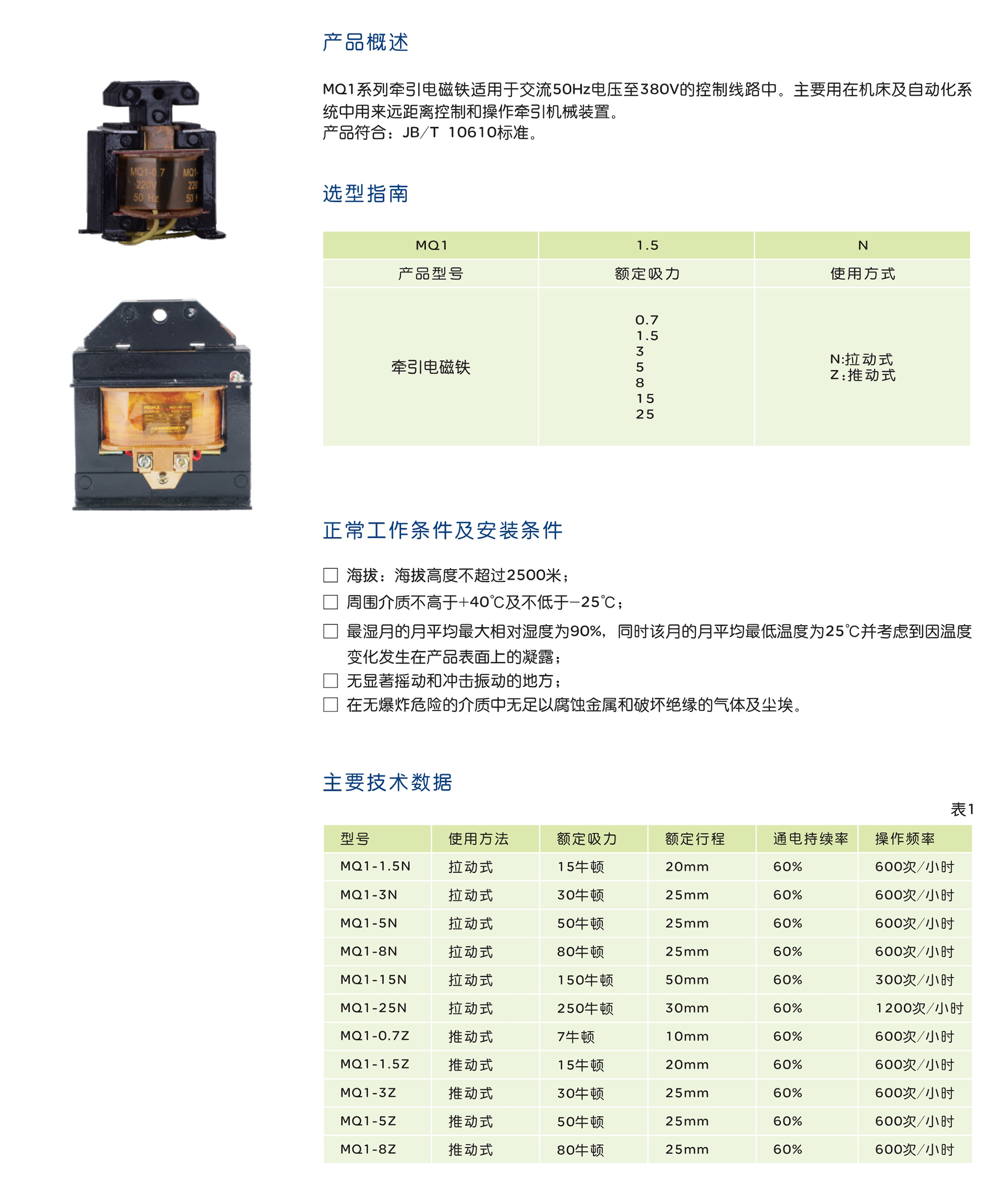 MQ1系列牽引電磁鐵適用于交流50Hz電壓至380V的控制線路中。主要用在機床及自動化系 統(tǒng)中用來遠距離控制和操作牽引機械裝置。 產(chǎn)品符合:JB/T 10610標準。
